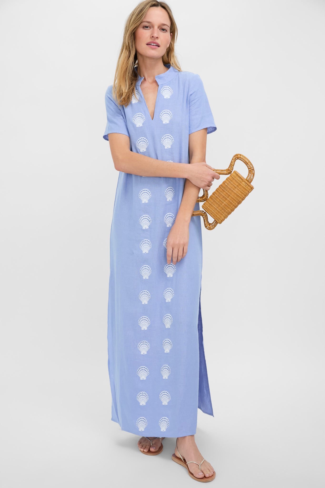 Blue and White Embroidered Shell Short Sleeve Caftan