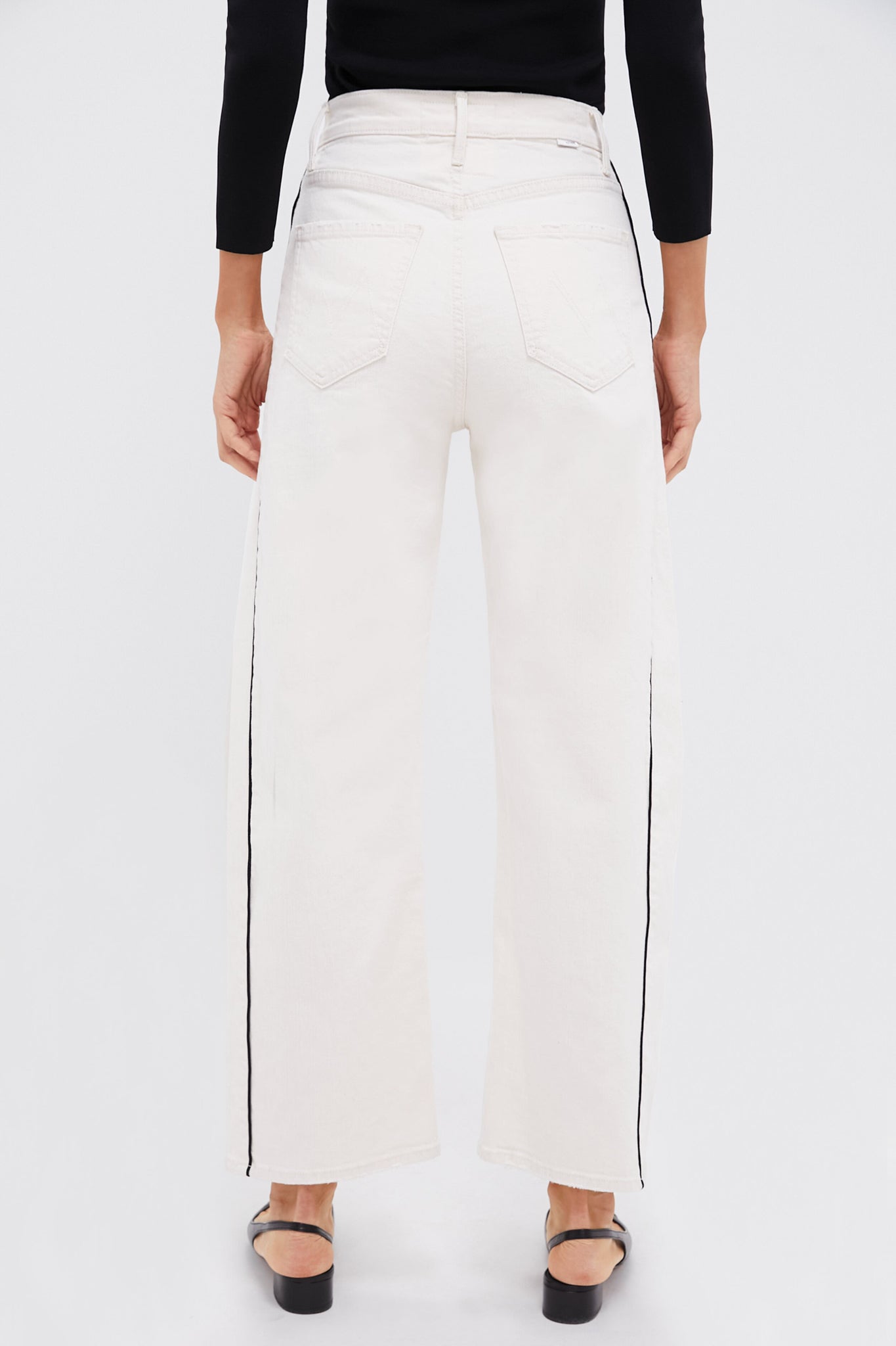 The Act Natural Piped The Half-Piped Ankle puts a fun twist on classic denim. Featuring a high rise. wide. curved leg. and black pinstripe detailing with tonal hardware. these pants are sure to become a wardrobe staple. Dress them up or down. we style them with a black top. slingback flats. and a handbag for chic and sophisticated style.