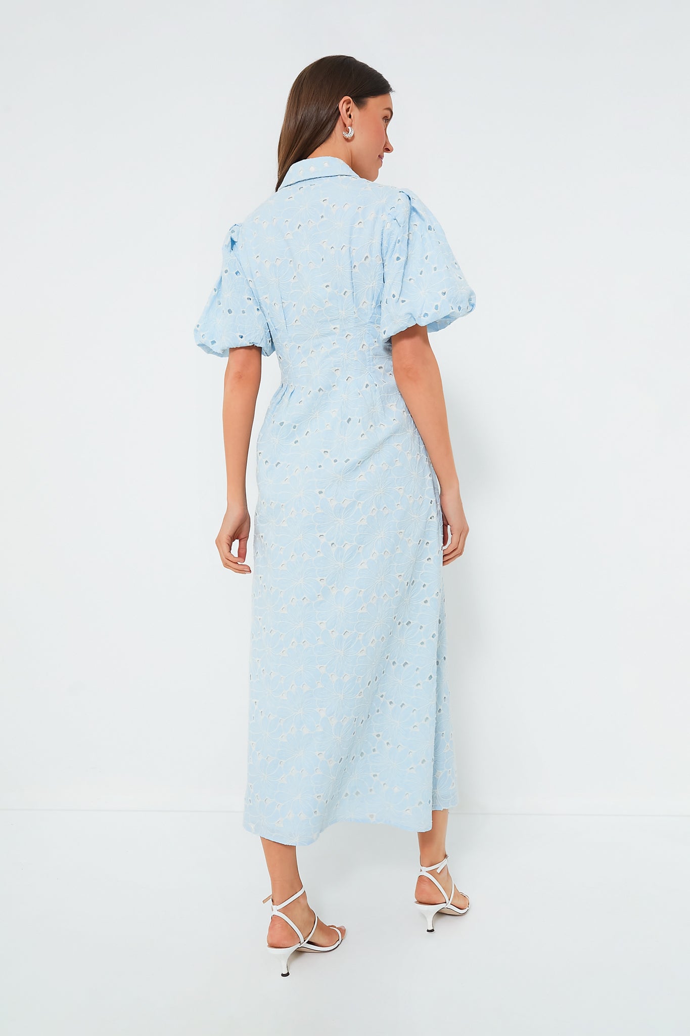 Baby blue with graceful. delicate details. the Airy Blue Eyelet Delaney Dress is pure elegance. This maxi boasts short puff sleeves. a covered partial front button placket. and a fitted waist with pleated details. Complement this style with heels and pearls for a feminine event look.