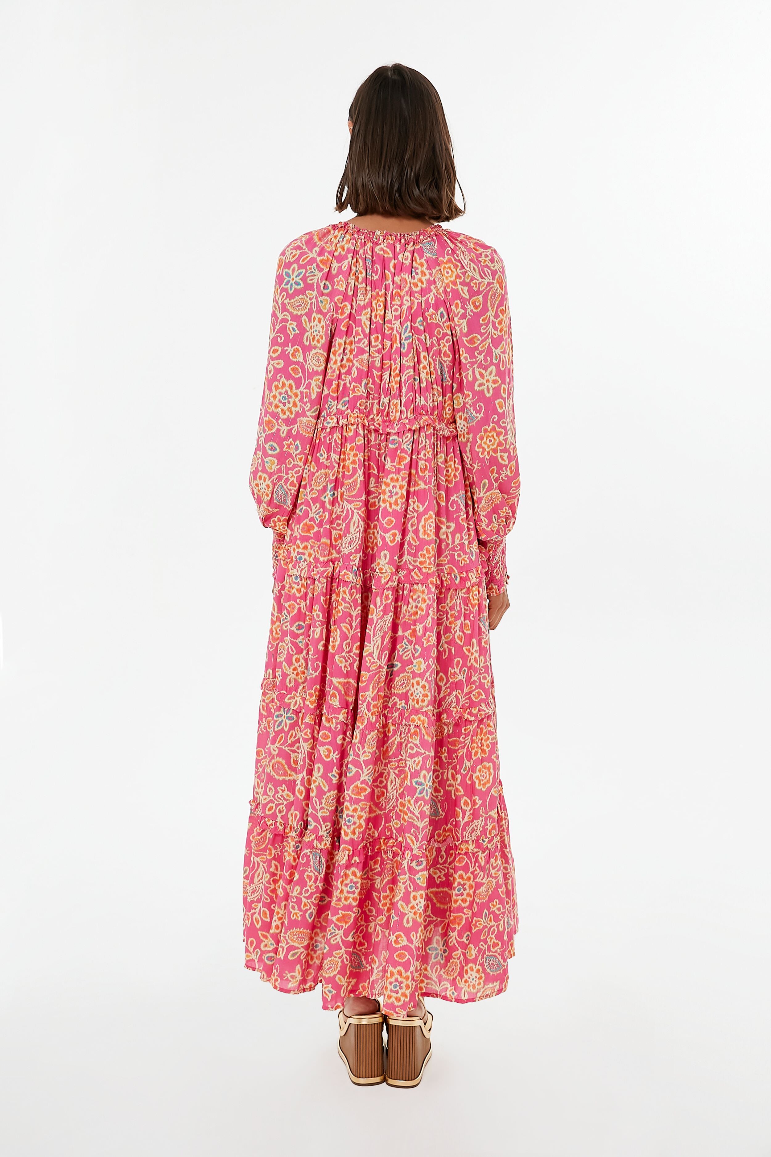 Designed in a retro-inspired pink. orange. and blue florals. the Alessandra Pink Print Monique Dress is the most stunning resort piece. Perfect for throwing on for happy hour and dinners seaside. this punchy piece features long sleeves with smocked cuffs to protect you from the sun and a gorgeously tiered maxi skirt that effortlessly flows with you. Opt for bold jewelry and platforms for a fun take on traditional beachwear!