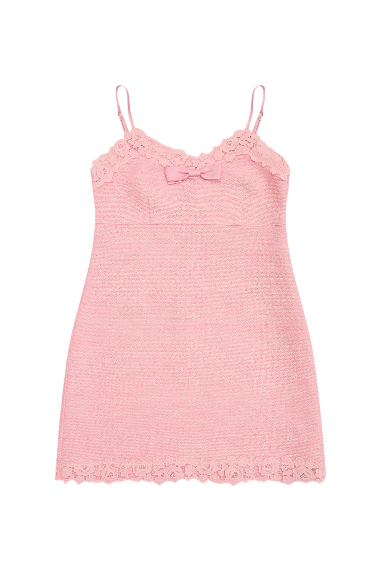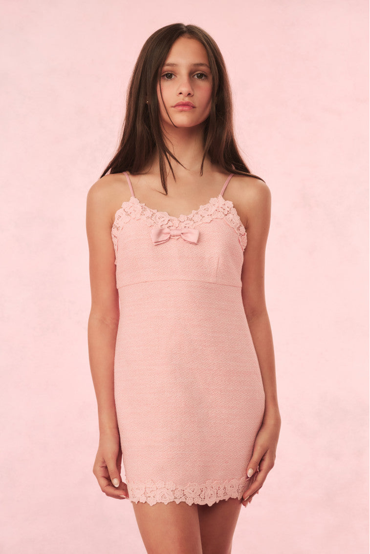 Our girls are chic in the Aloma Dress. This stunning dress is designed from a tailored tweed fabric and features intricate floral lace details. The piece has thin spaghetti straps and a flattering. slim fit silhouette.