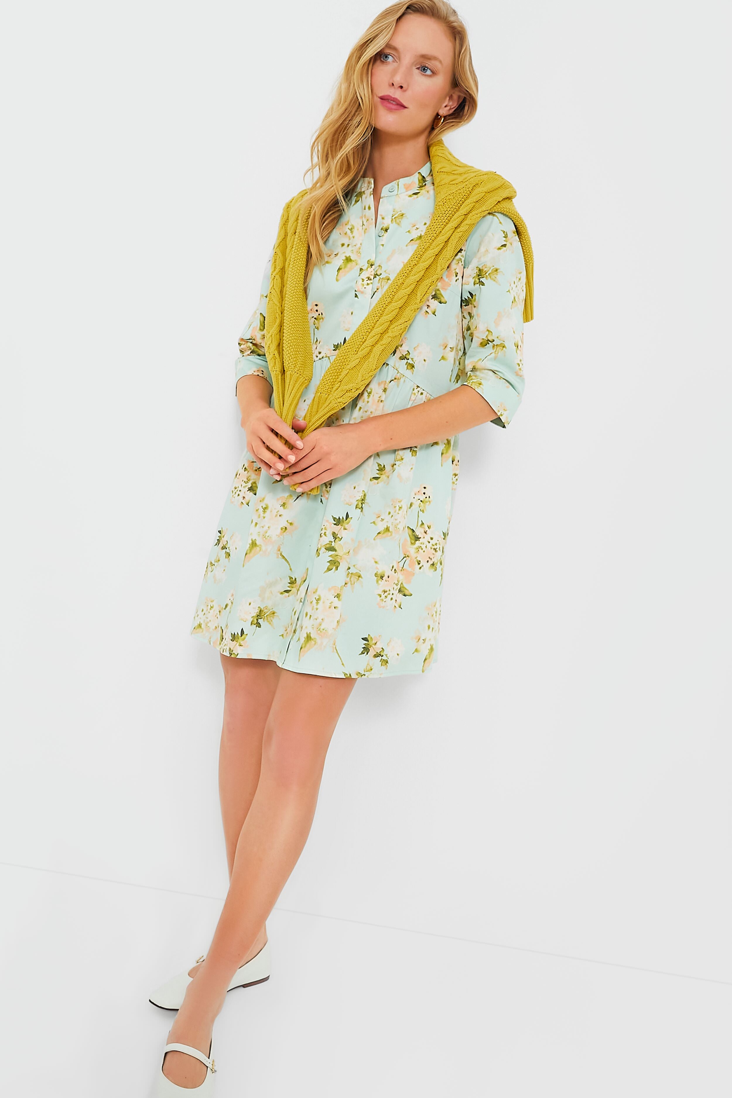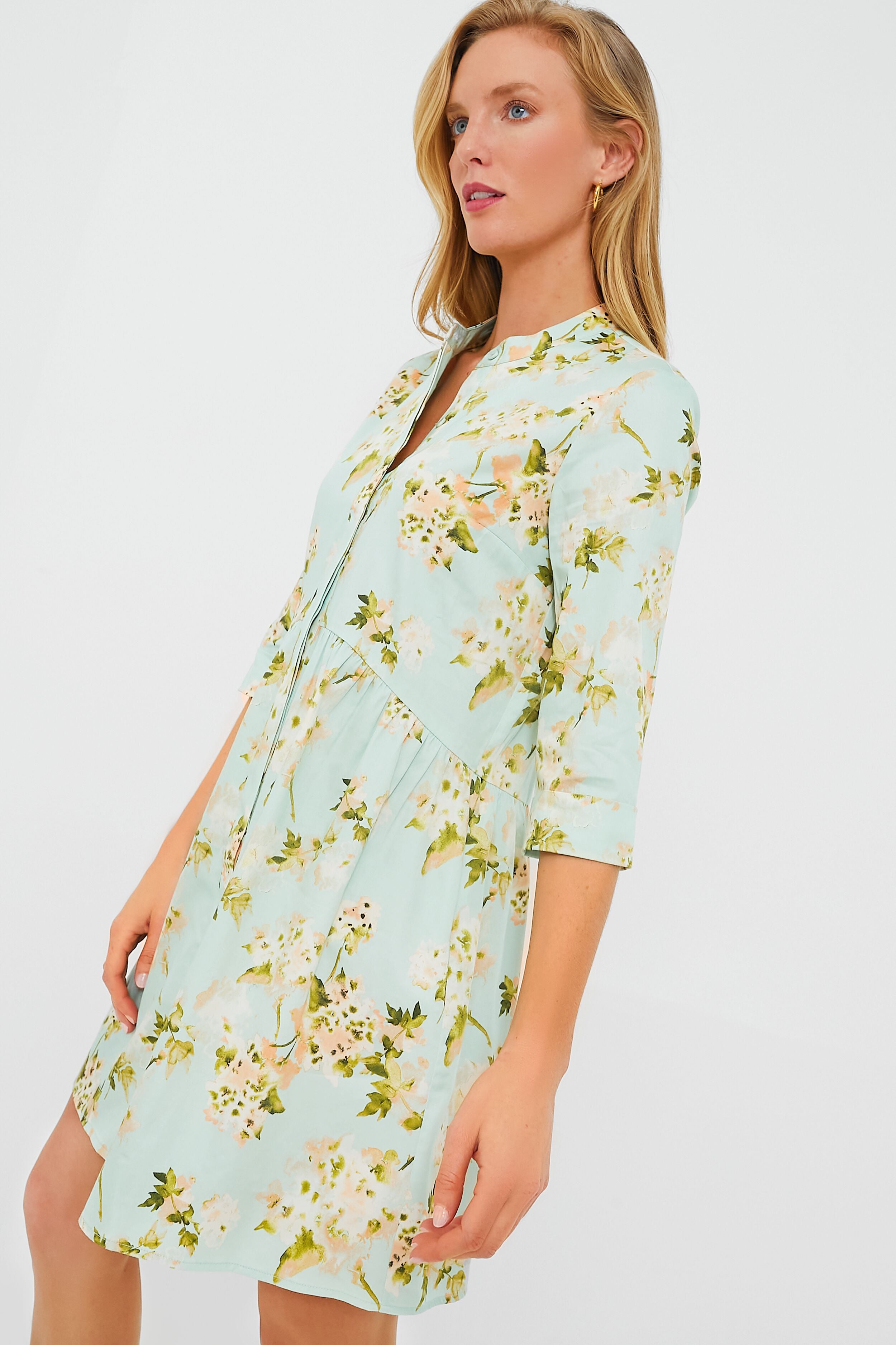 This beautifully printed silhouette is made for your closet! The Aqua Watercolor Royal Shirt Dress is amazingly lightweight and a perfect transition piece that is easy to accessorize. Featuring a round neckline. three-quarter sleeves. and a front button placket. this mini is flattering and flirty. Style with sandals and a tote for strolling around town. or with espadrilles and gold jewelry for an elevated dinner look.