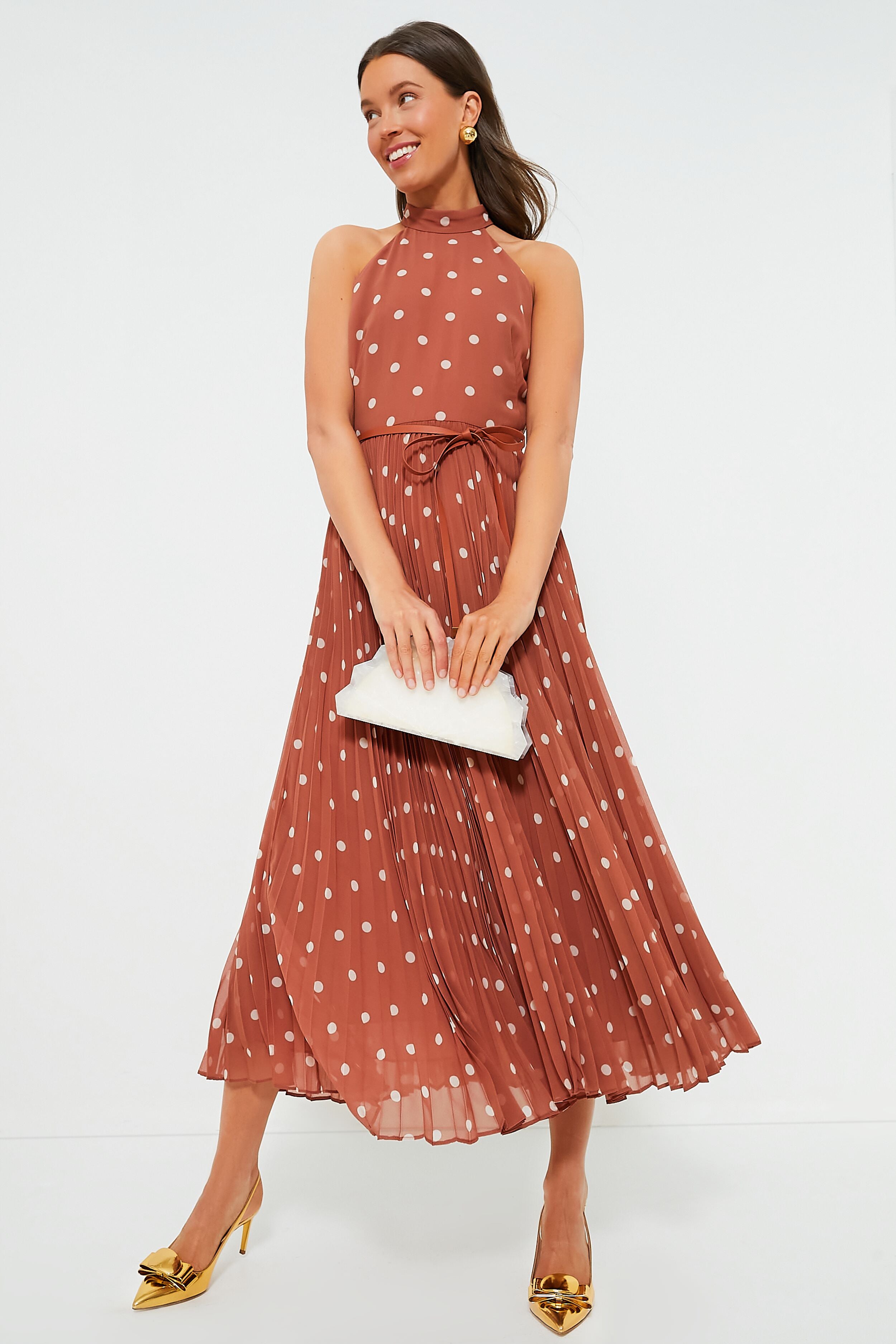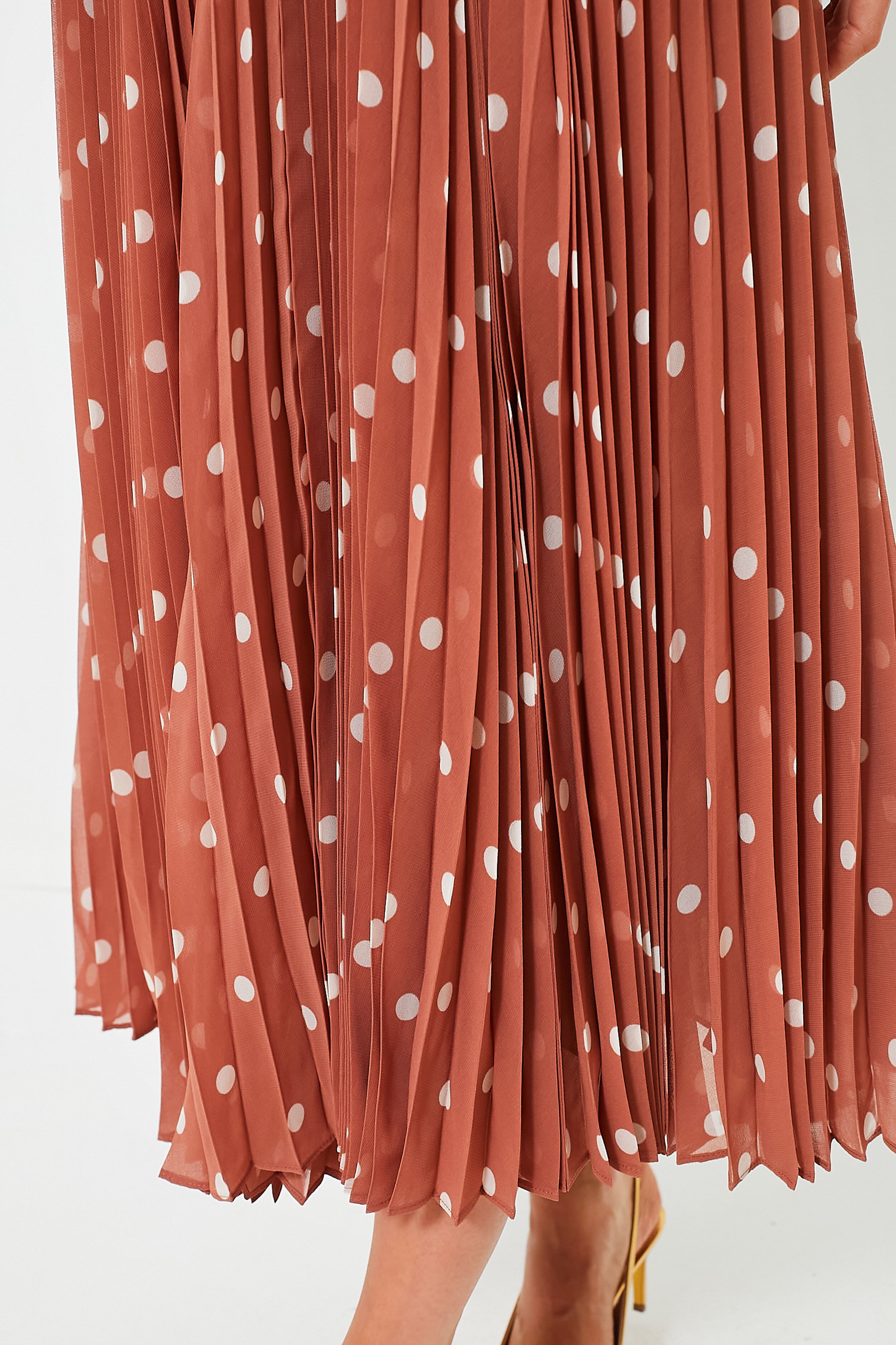We are loving the Aragon and Cream Dot Sunray Picnic Dress for all of our spring and summer events. This midi is equal parts retro-classic and modern-chic. boasting a high neck. self-tie waistband. and pleated skirt. Complement the brown and cream polka dot pattern with neutral heels or sandals!