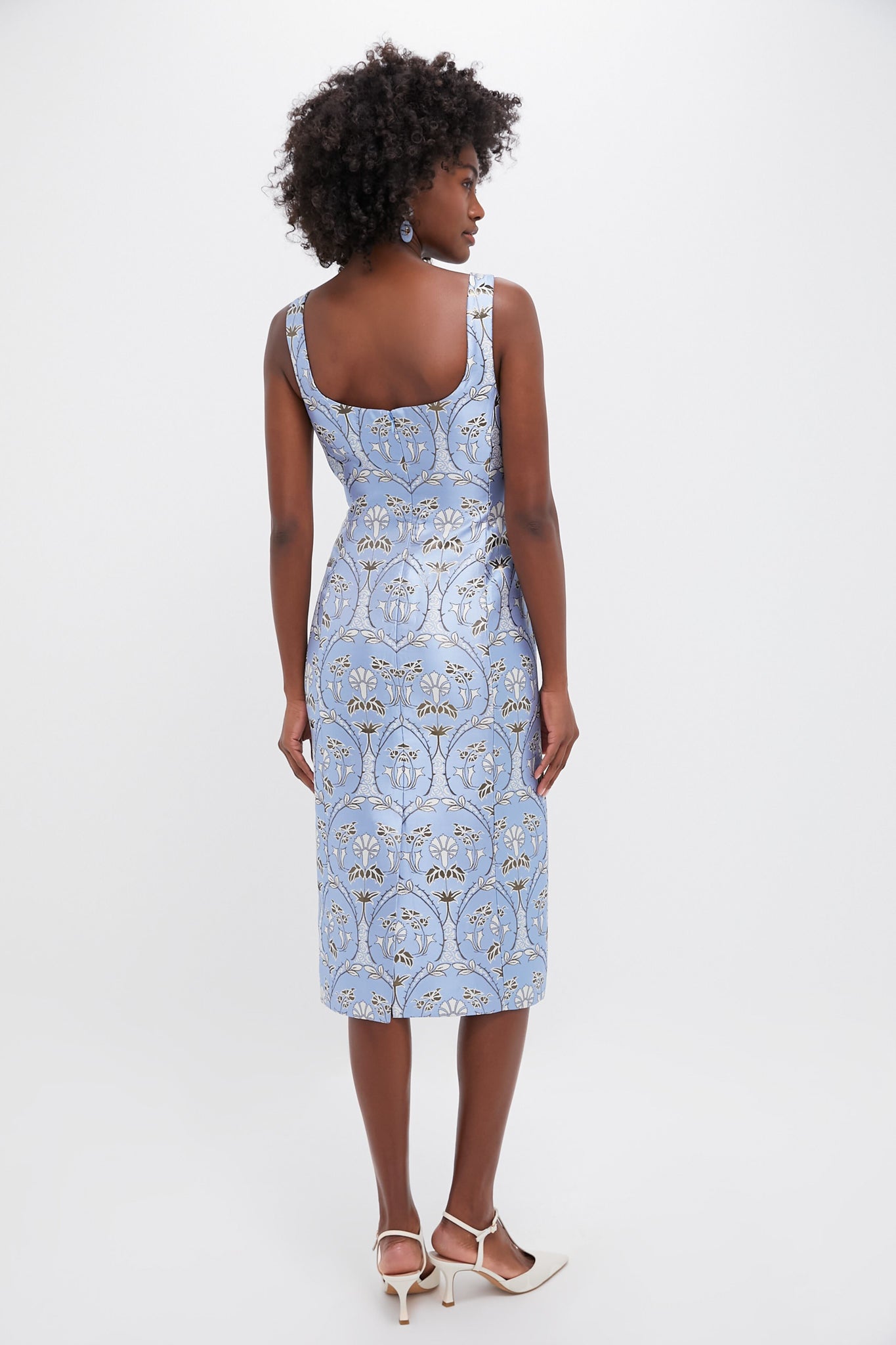 The Arcada Light Blue Carlie Dress features a stunning and delicate fabric in a classic silhouette. With a column silhouette. square neckline. and structured bodice. this dress is sure to turn heads! We recommend pairing with a white clutch. heels. and statement earrings for your next special occasion.