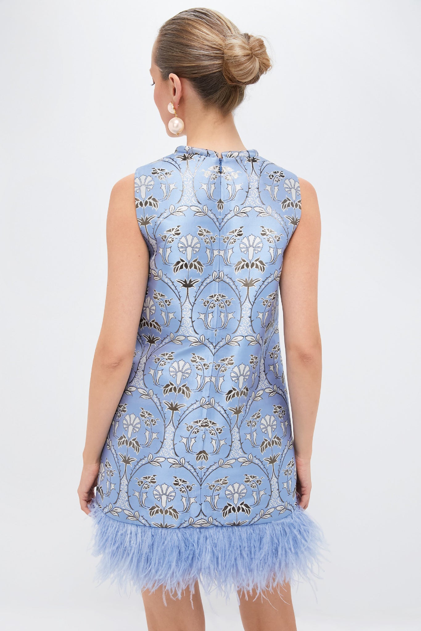 The Arcada Light Blue Paige Dress features a stunning and delicate fabric in a classic silhouette. With a shift shape. tubular neck trim. and decorative feathers at the hem. this dress is sure to turn heads! We recommend pairing with statement pearl earrings and a silver handbag and heels!