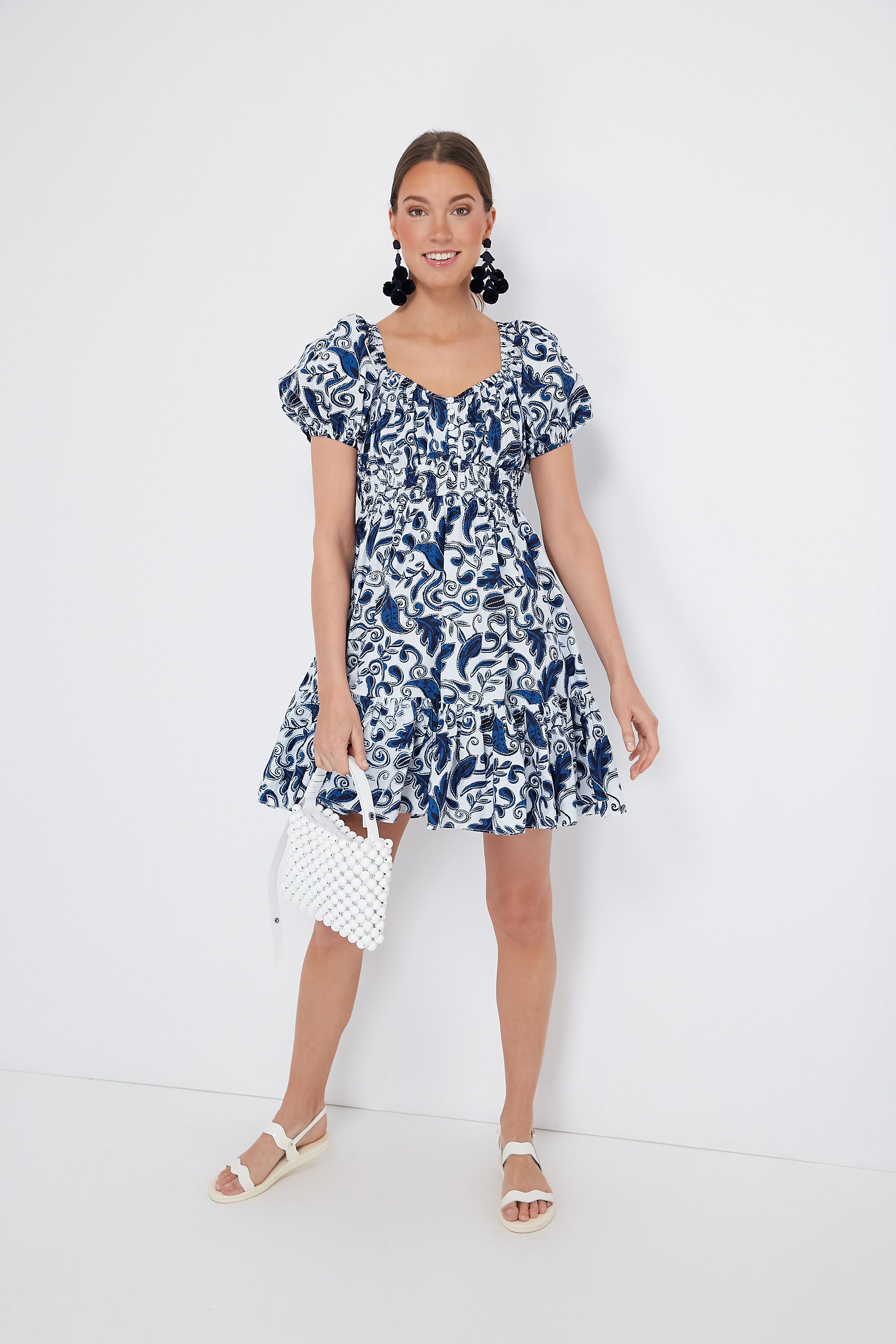 The flirtiest little mini we have seen lately. we are loving the Azulejo Bea Dress. Deep blue paisley swirls adorn a crisp white cotton fabric in an intricate print — but the details don't stop there! With a sweetheart neckline. a scoop back with crisscrossed ties. a smocked waist. and a ruffled hem. this silhouette is effortlessly feminine yet functional enough for all-day wear. Unlined to help you feel the breeze on warm days. this style looks perfect when styled with sandals and raffia accessories or sneakers and sunnies.