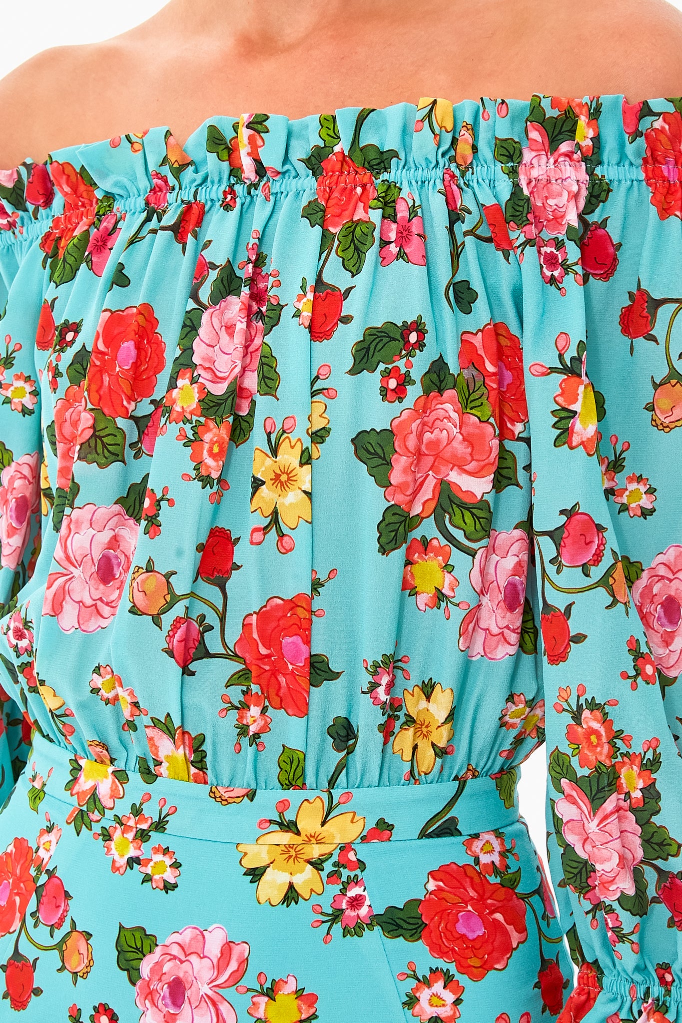The Azure Dahlia Grace Dress is crafted from silk crepe de chine with a layered modern floral motif. Featuring an off-the-shoulder silhouette with a fitted waist and elbow-length puff sleeves. this style is elevated and unique. Pair with heels and statement earrings for special celebrations.
