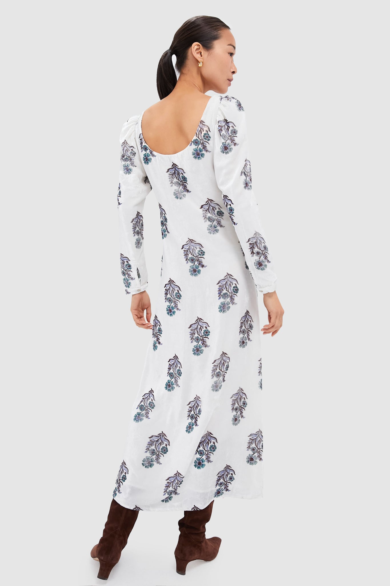 The Paloma Dress boasts beauty and elegance. This winter white velvet fabric features a hand-block printed design and a subtle scoop neckline. Perfect for winter gatherings. we paired this dress with boots and a bag to ensure its the star of the show.