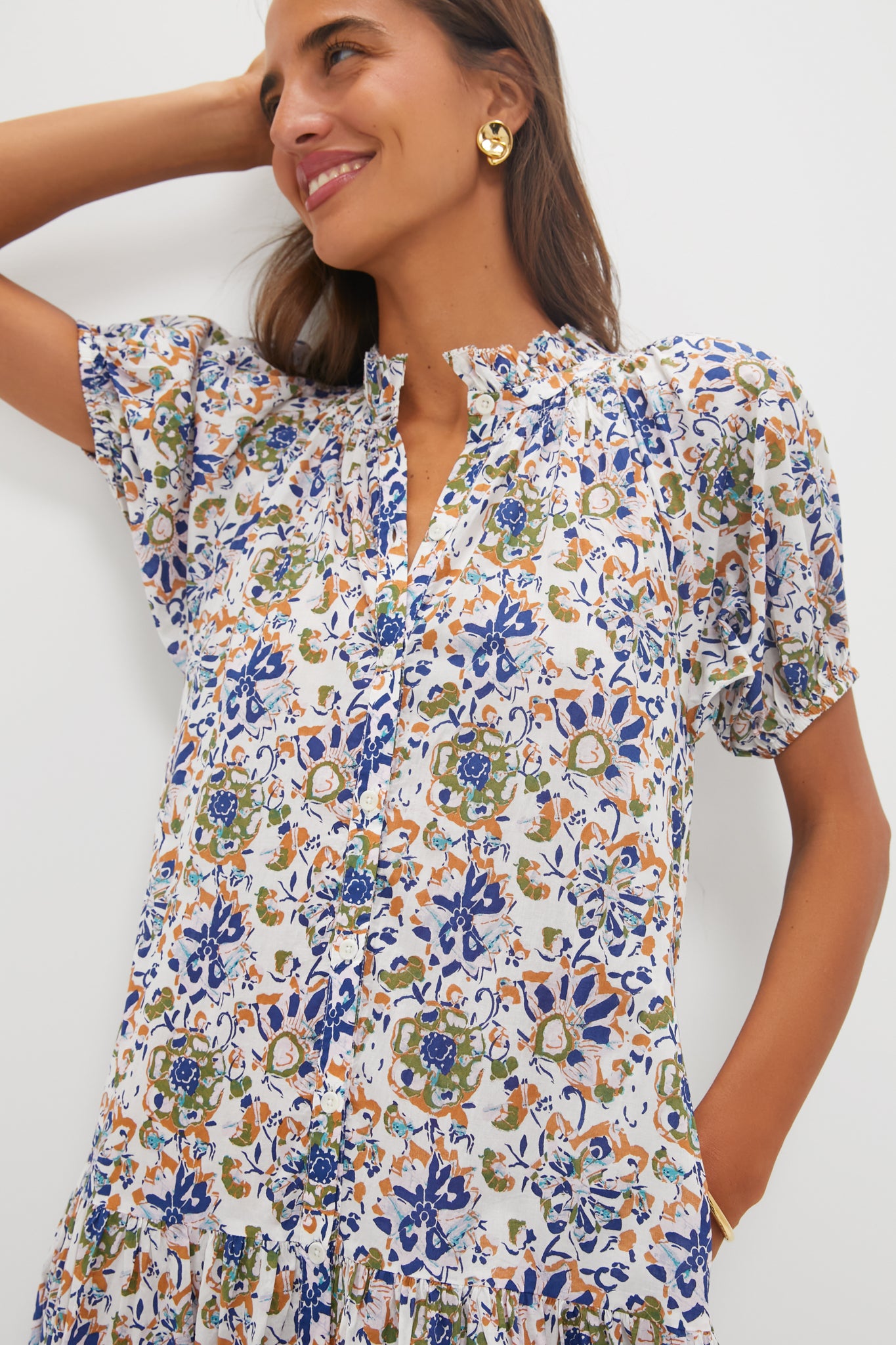 The Batik Floral Cream Mazza Maxi is an elevated everyday style. Boasting short puffed sleeves. a tiered skirt. and a self-tie waist belt. the flattering silhouette is complimented with an intriguing multi-colored print. Pair with heels or flats for an instantly put-together look!