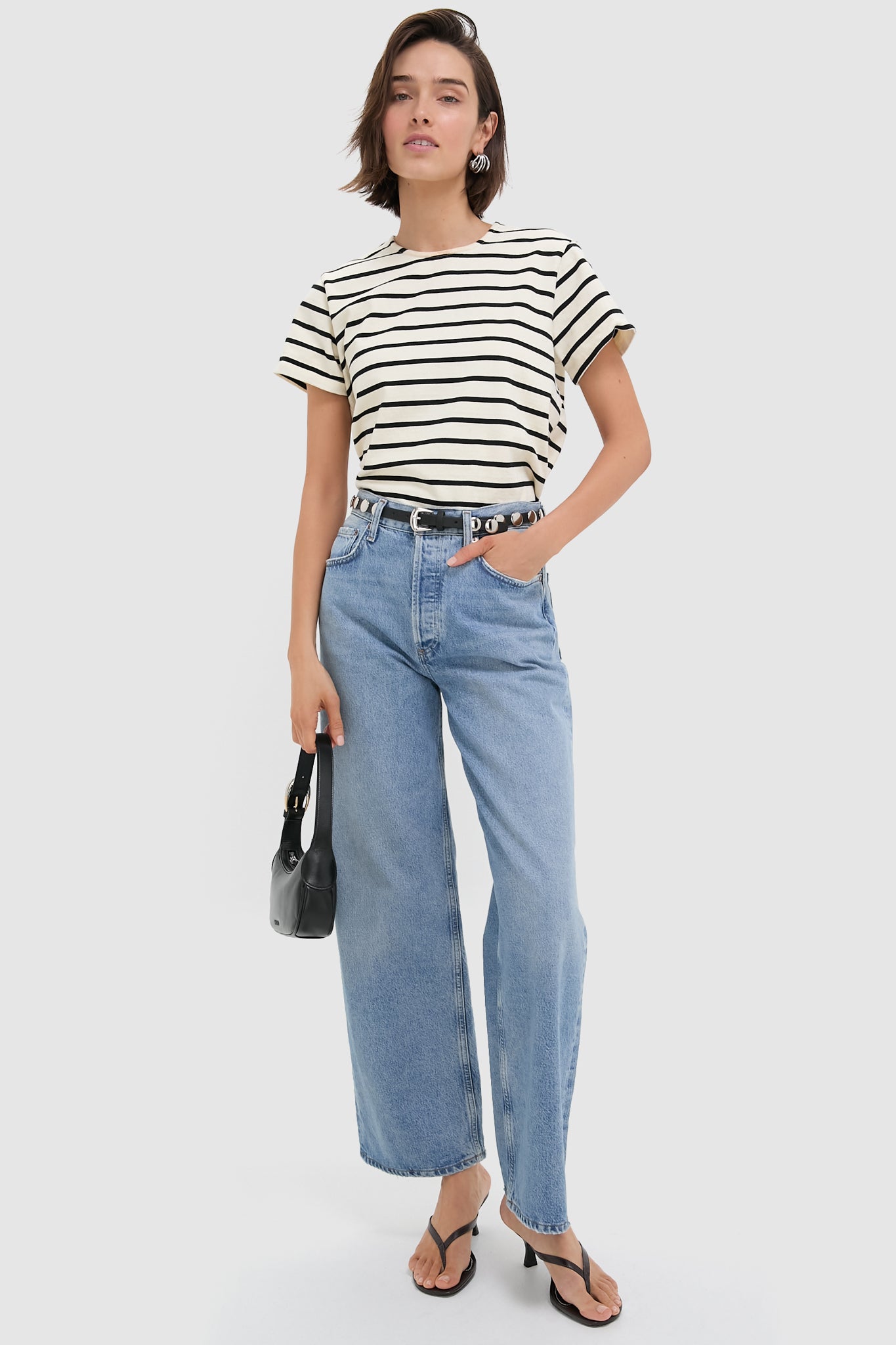The Black and Silver Ames Belt is an elevated belt with edgy details. Designed with dome metal studding along the leather strap and a polished buckle. this thin hip belt adds a subtle statement to every look.