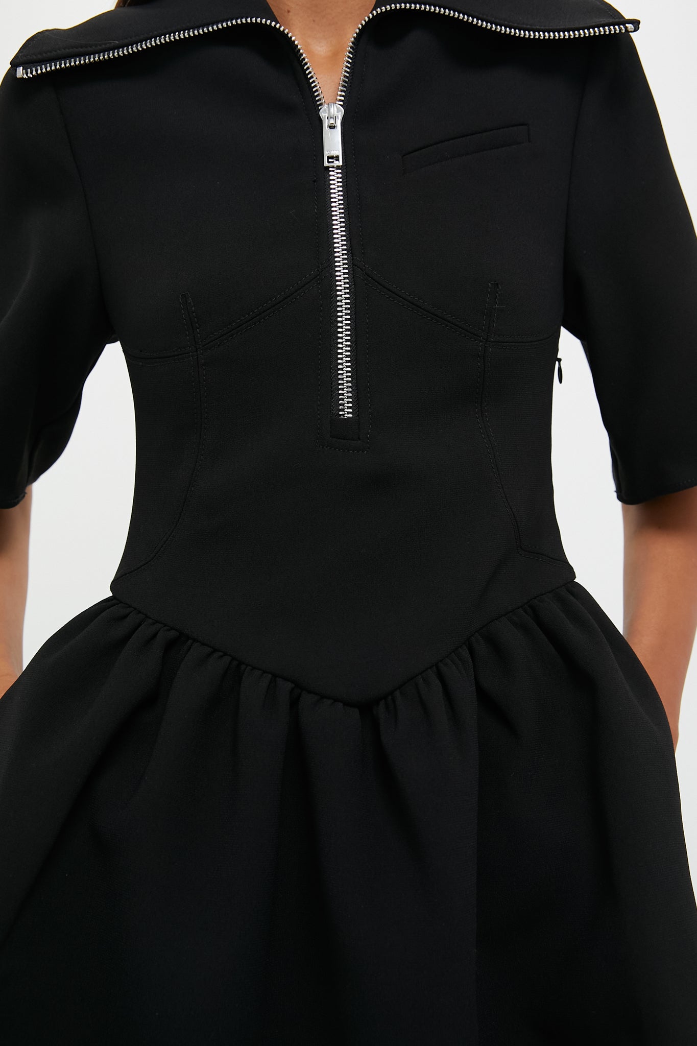 The Black Bonded Crepe Dress is crafted from recycled polyester with a textured. crepe-like finish. and features a versatile high collar that can be worn up or folded down. Finished with black stitch detailing. and defined by a bold heavy silver zipper and a playful flouncy skirt. this mini makes it perfect for both everyday wear and special occasions.