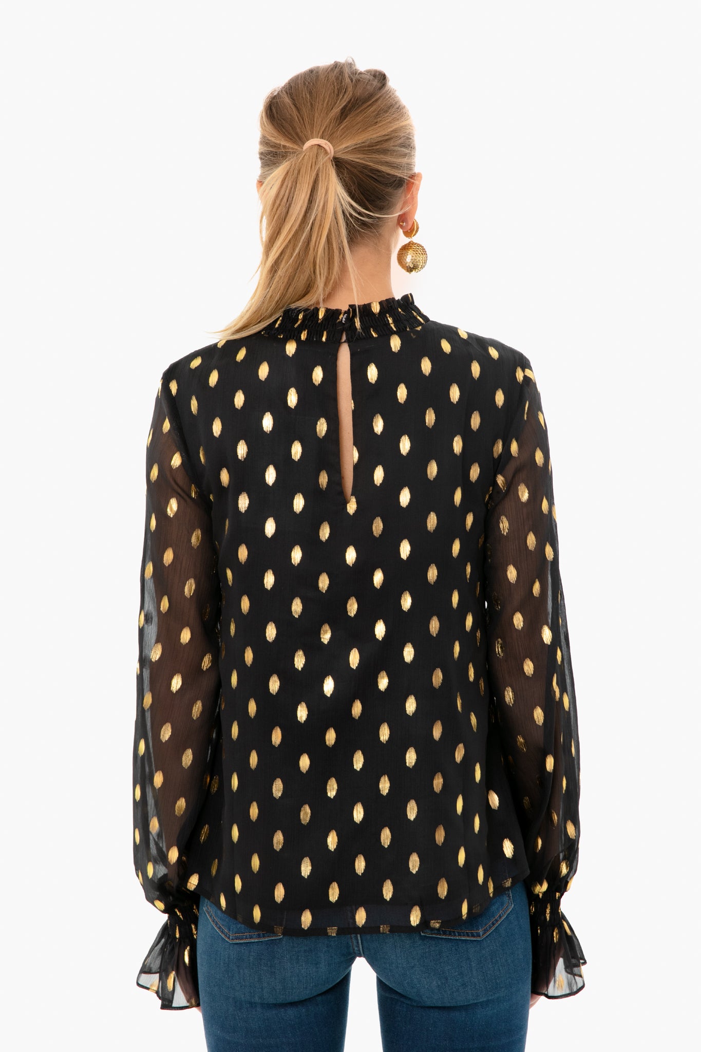 We are loving feminine details this season and the Black Celeste Blouse does not disappoint. Featuring sheer sleeves. elastic cuffs and neck. and an overall shimmer. this is guaranteed to wow. Add a little sparkle to your look with a beaded clutch and earrings!