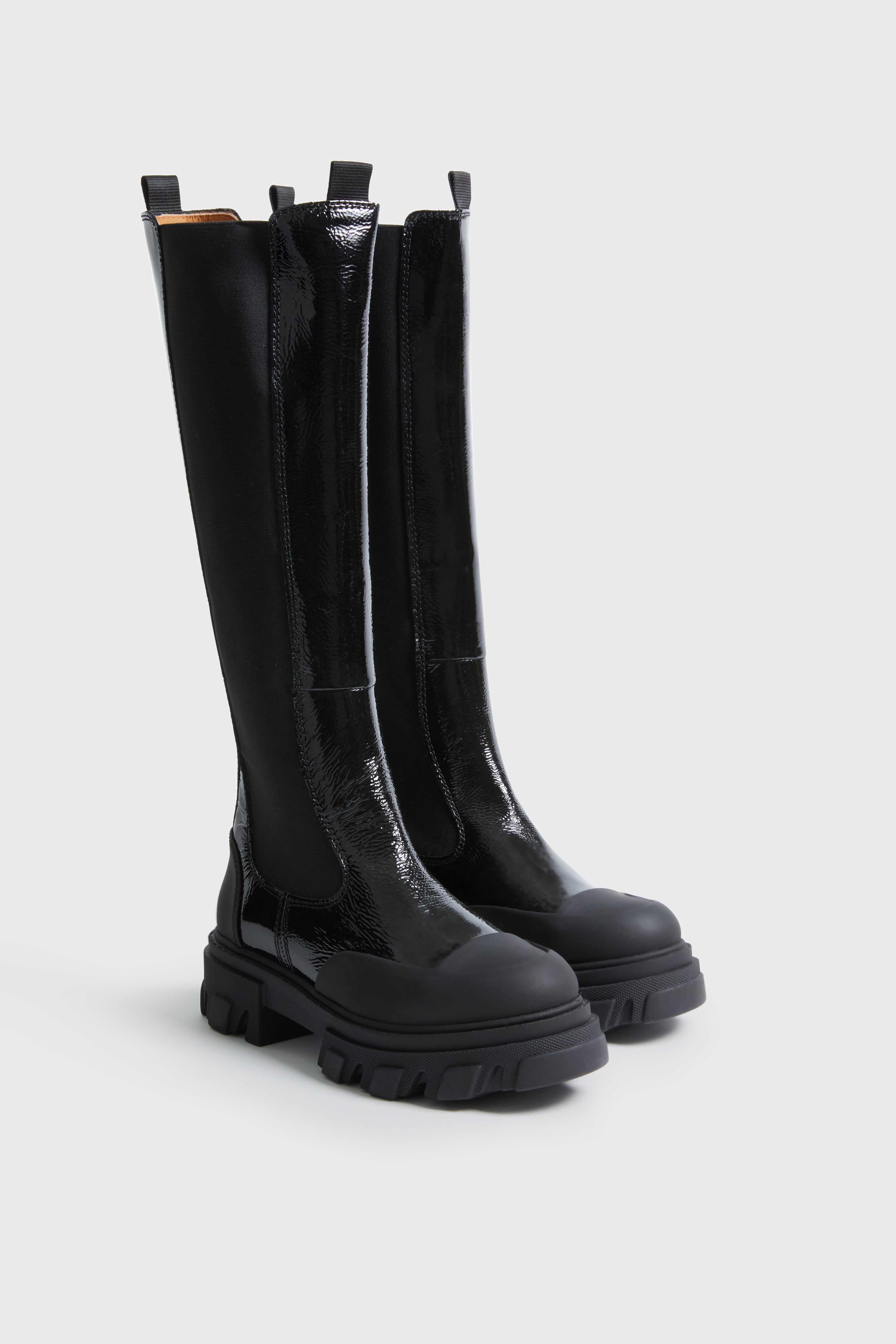 Meet the Black Cleated High Chelsea Boots - a bold and fashionable choice for the modern trendsetter. Featuring a chunky cleated sole for extra height and elastic panels with pull tabs for effortless pull-on styling. they offer both style and stability. Perfect for a night out. these knee-length shoes can be paired with dresses. skirts. or skinny jeans.