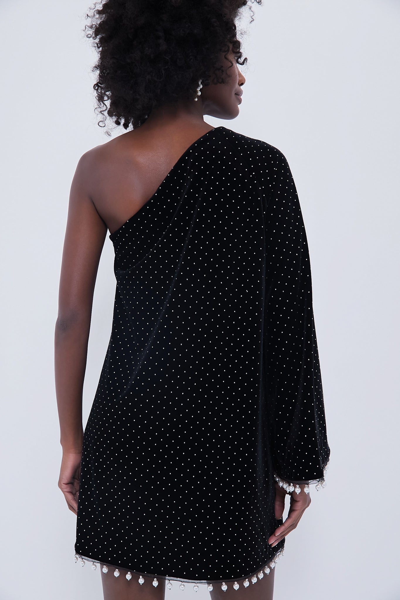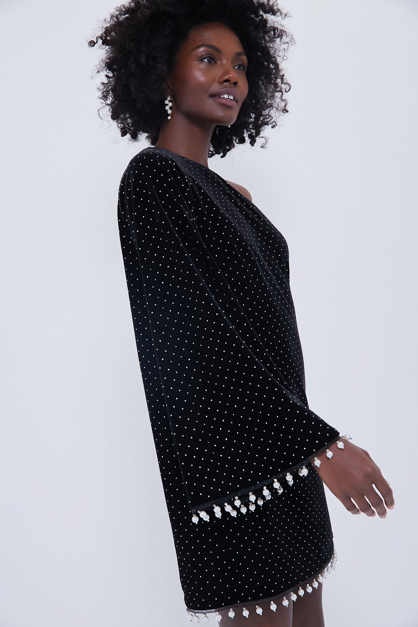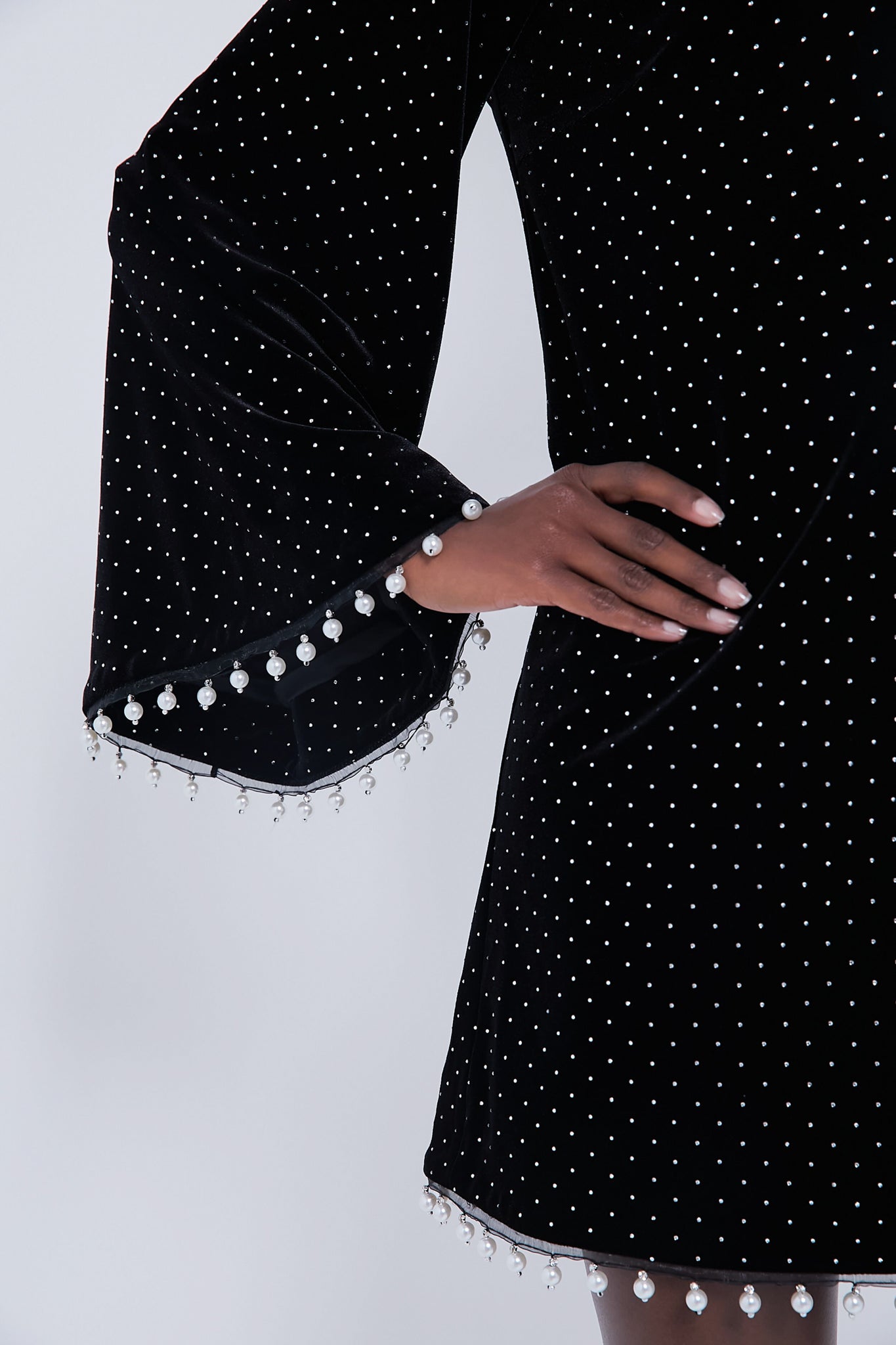 Adorned with tiny crystals against a midnight black velvet. this Black Crystal Velvet Vida Dress boasts delicate pearls trim the hem and cuff. Perfect for all your RSVPs this season. style this dazzling mini with statement earrings and heels for an added extra sense of wow.