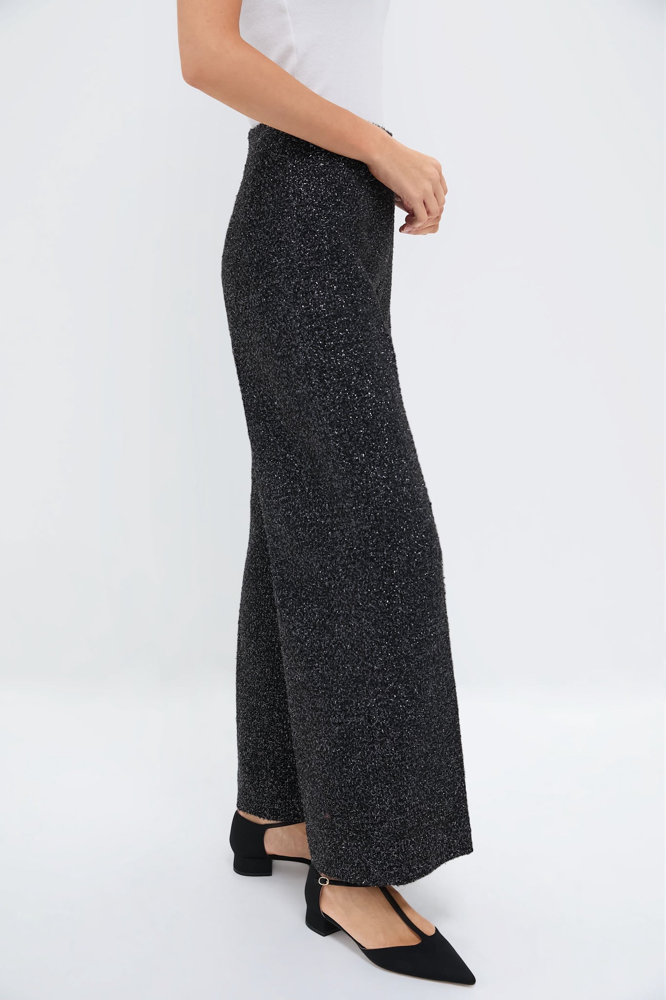 Adding a tailored sensibility to your evening repertoire. the Daffy trousers in disco tweed are crafted from a blend that shimmers in the light. Cut to a high waist-band. these black wide-leg trousers are woven with metallic threads. and are finished with a pressed crease through the legs to maintain a sharp silhouette. Pair with the matching Trixie top. heels. and a clutch for a chic and timeless look.