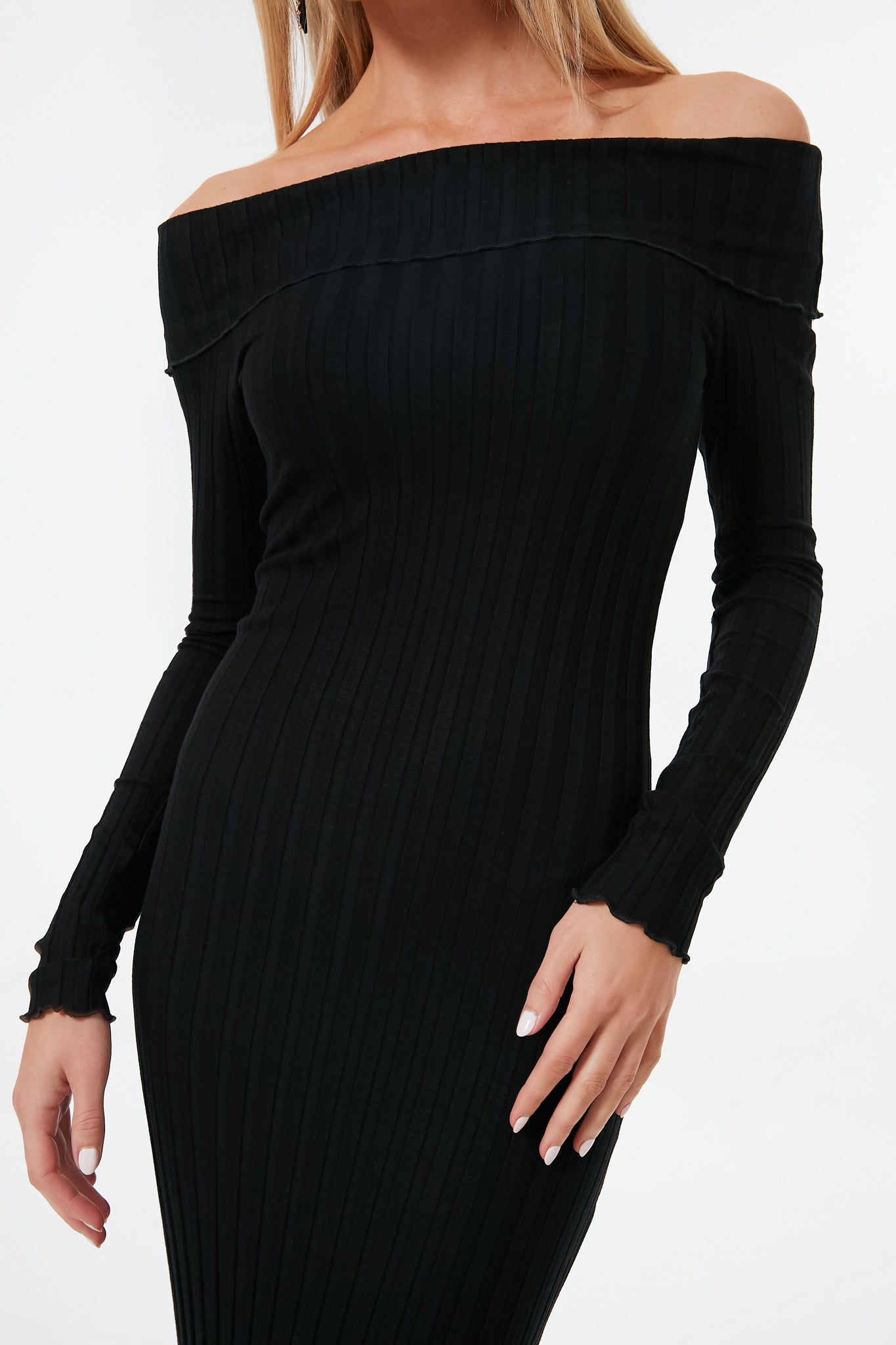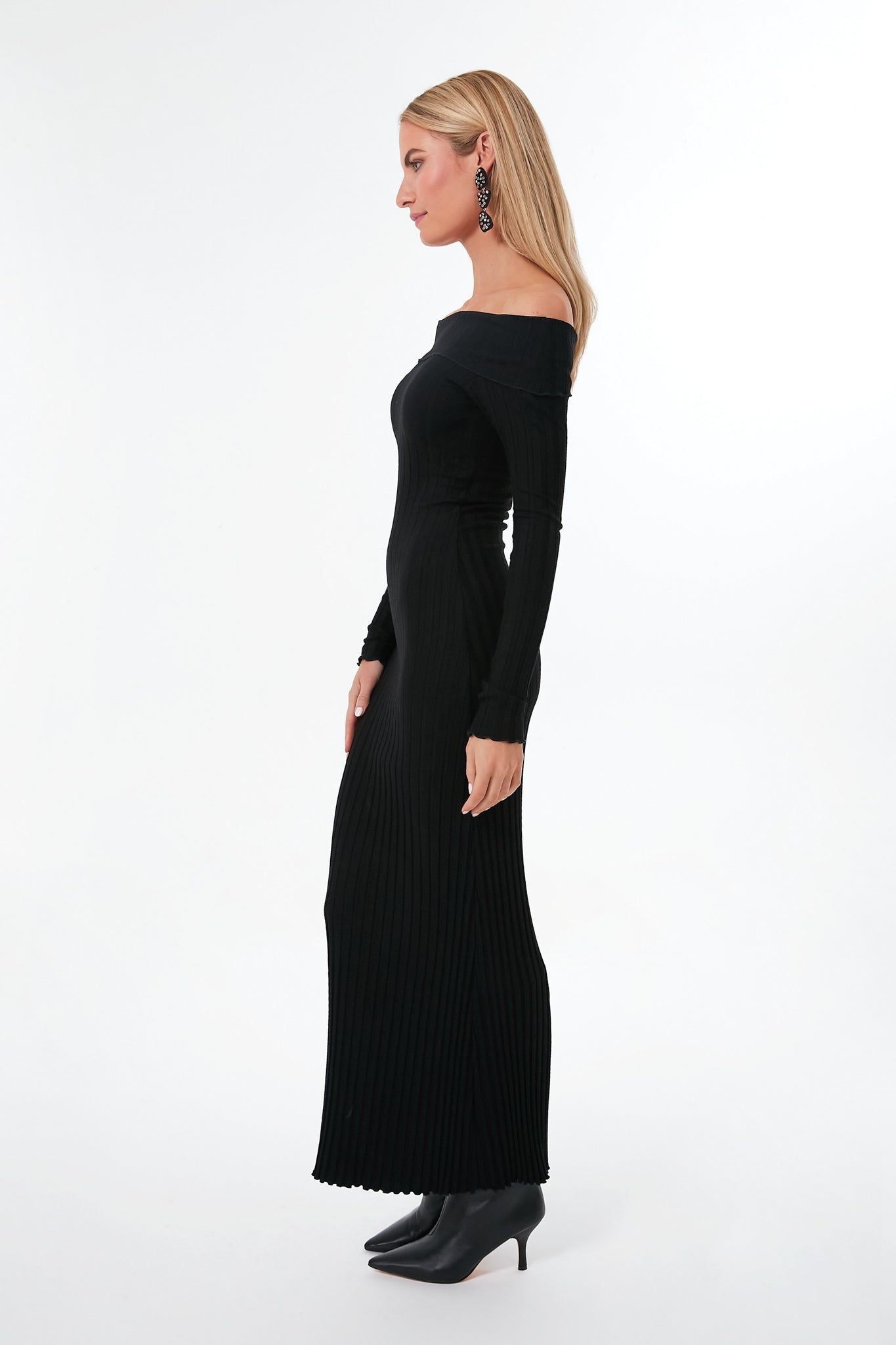 Sophisticated and Glamorous in equal measure. the Espen Dress is an easy way to be the best-dressed at any event. An off-shoulder black dress will never go out of style. and this version has the added luxury of a ribbed texture made from modal for an incredibly soft composition that will feel comfortable all night long. Add a pop of color with bright heels and jewelry to be the belle of the ball.
