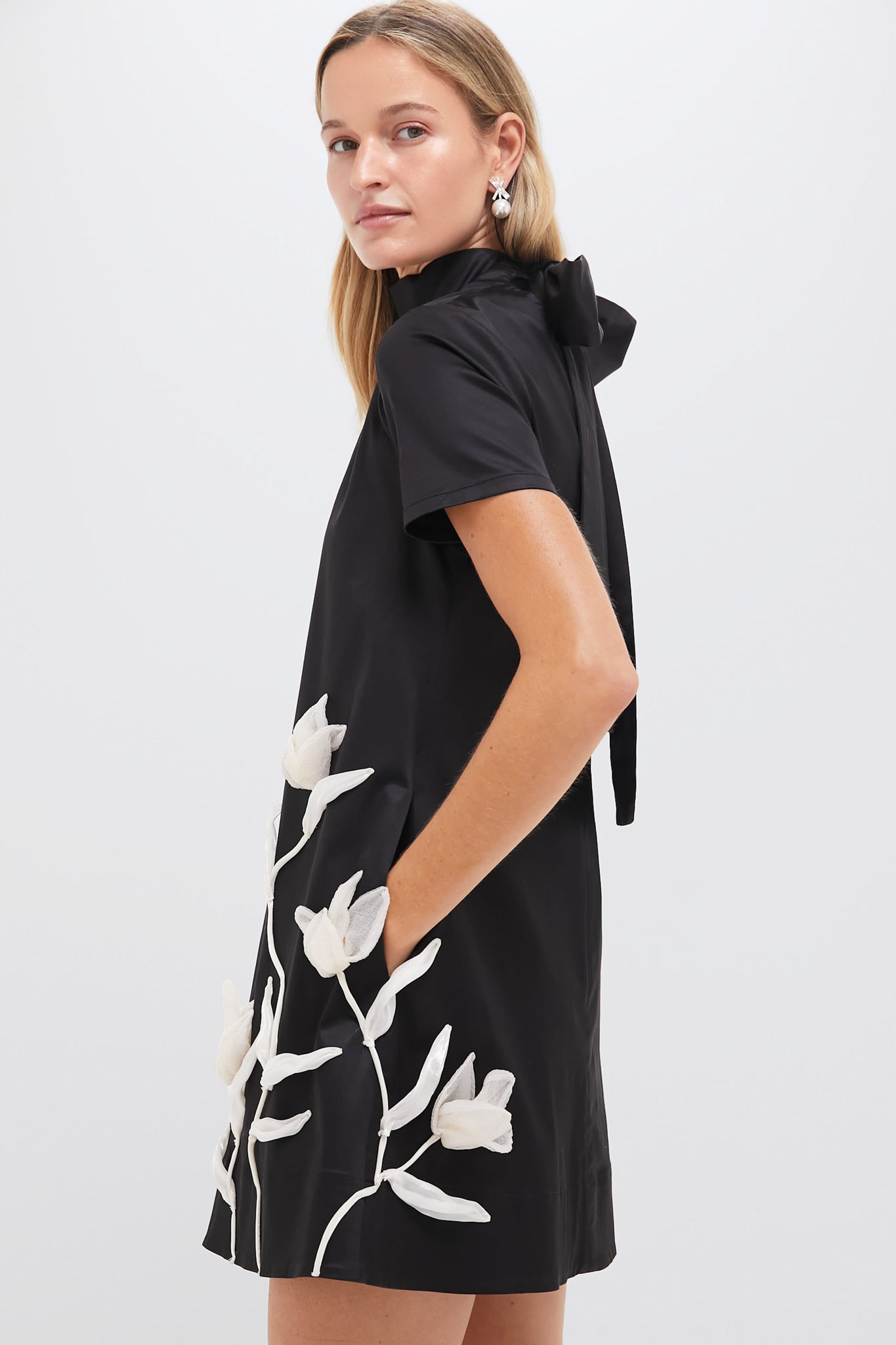 The Mini Ilana features a stunning floral applique design. a high neck. and scoop back with functional self-tie bow collar. We chose to pair this showstopping LBD with a chic earring. black clutch and heels. perfect for when you're not sure what to wear to your next cocktail event!