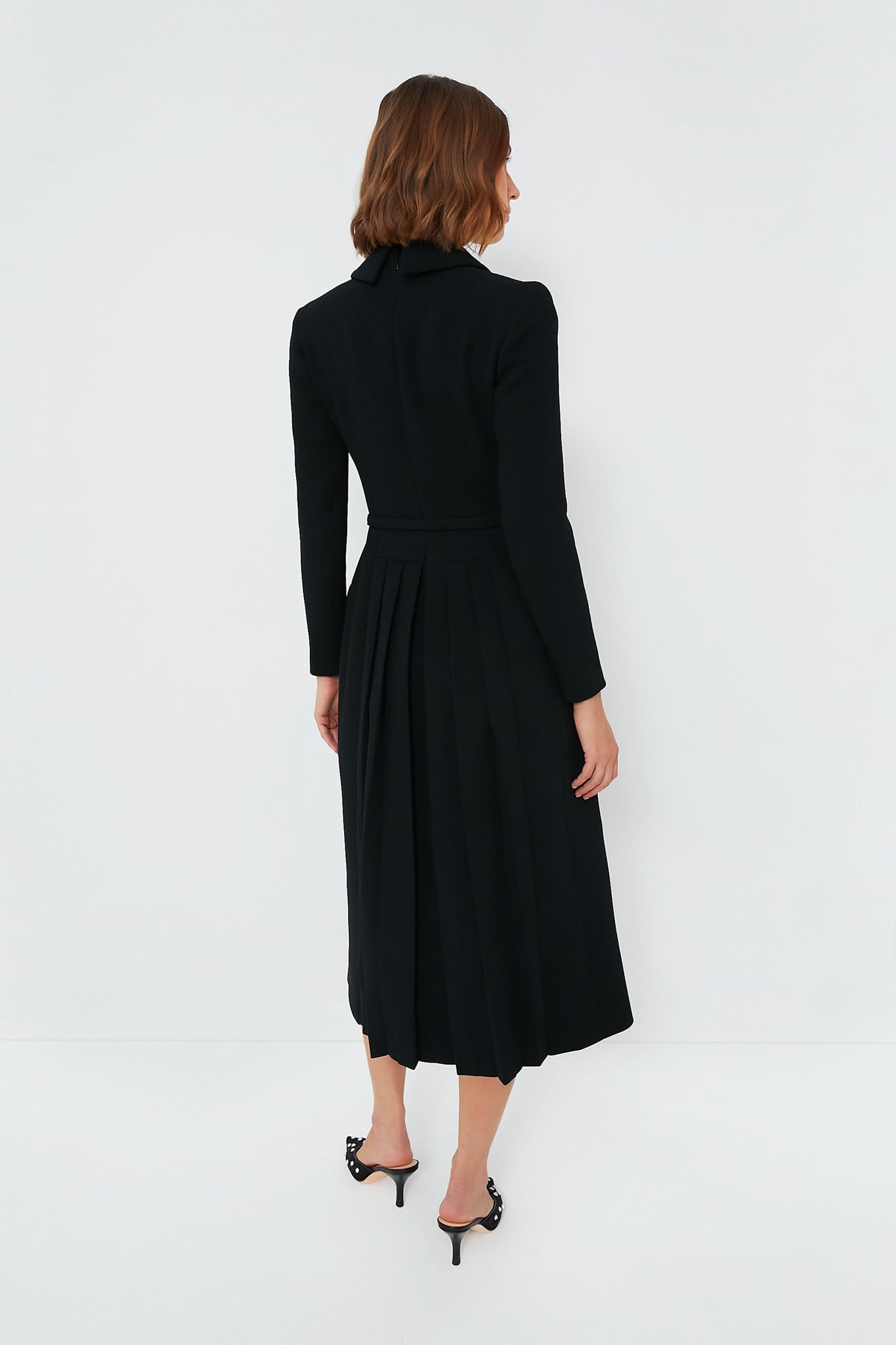 The Kalonice Dress is a fusion of classic tailoring and modern sophistication. Crafted from luxurious double crepe fabric in a captivating black shade. this coat midi exudes timeless elegance. Delicate pleat detailing on the back adds texture and movement. while a sleek belt cinches the waist for a flattering silhouette. Perfect for both formal occasions and everyday chic. this versatile number is sure to elevate your wardrobe.