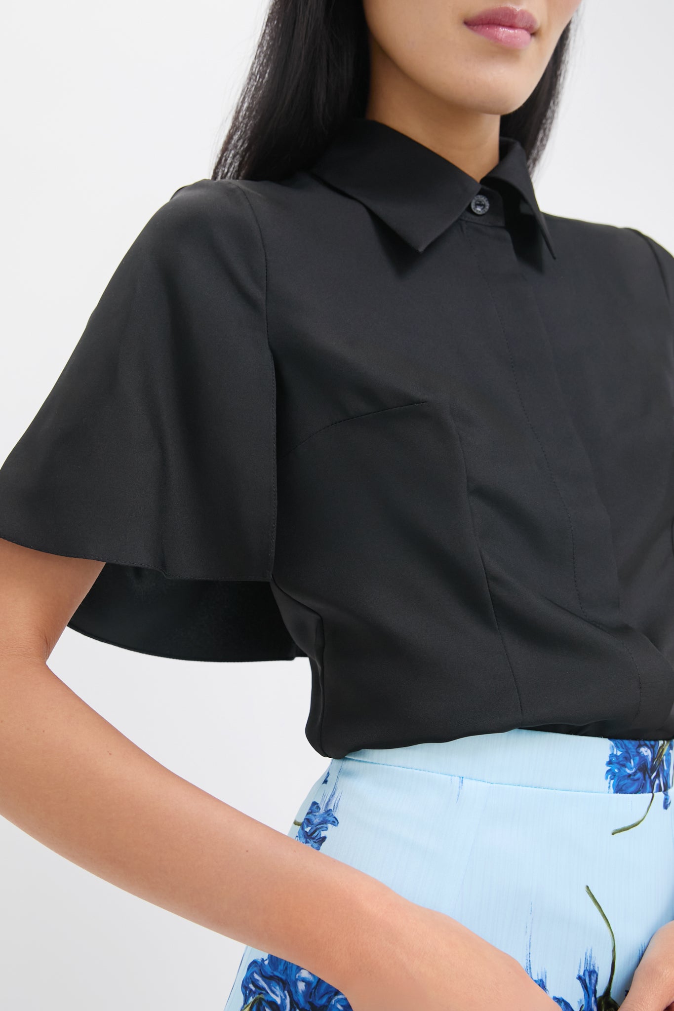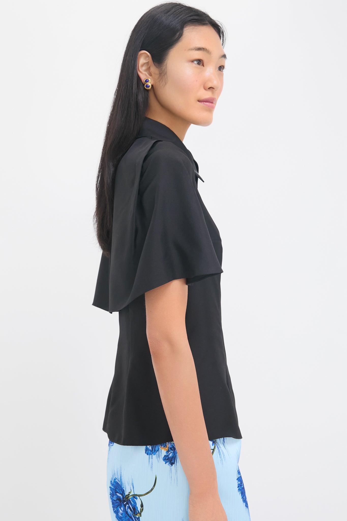 The Keiko Silk Twill Top embodies luxury and elegance. Crafted from soft silk twill. it features a sleek cape feature and a relaxed silhouette for modern versatility. With its timeless black hue. this top transitions effortlessly from formal occasions to off-duty elegance. combining classic charm with contemporary style. We paired it with the Silver Metallic Seersucker Kensie Skirt. a clutch. and black heels.