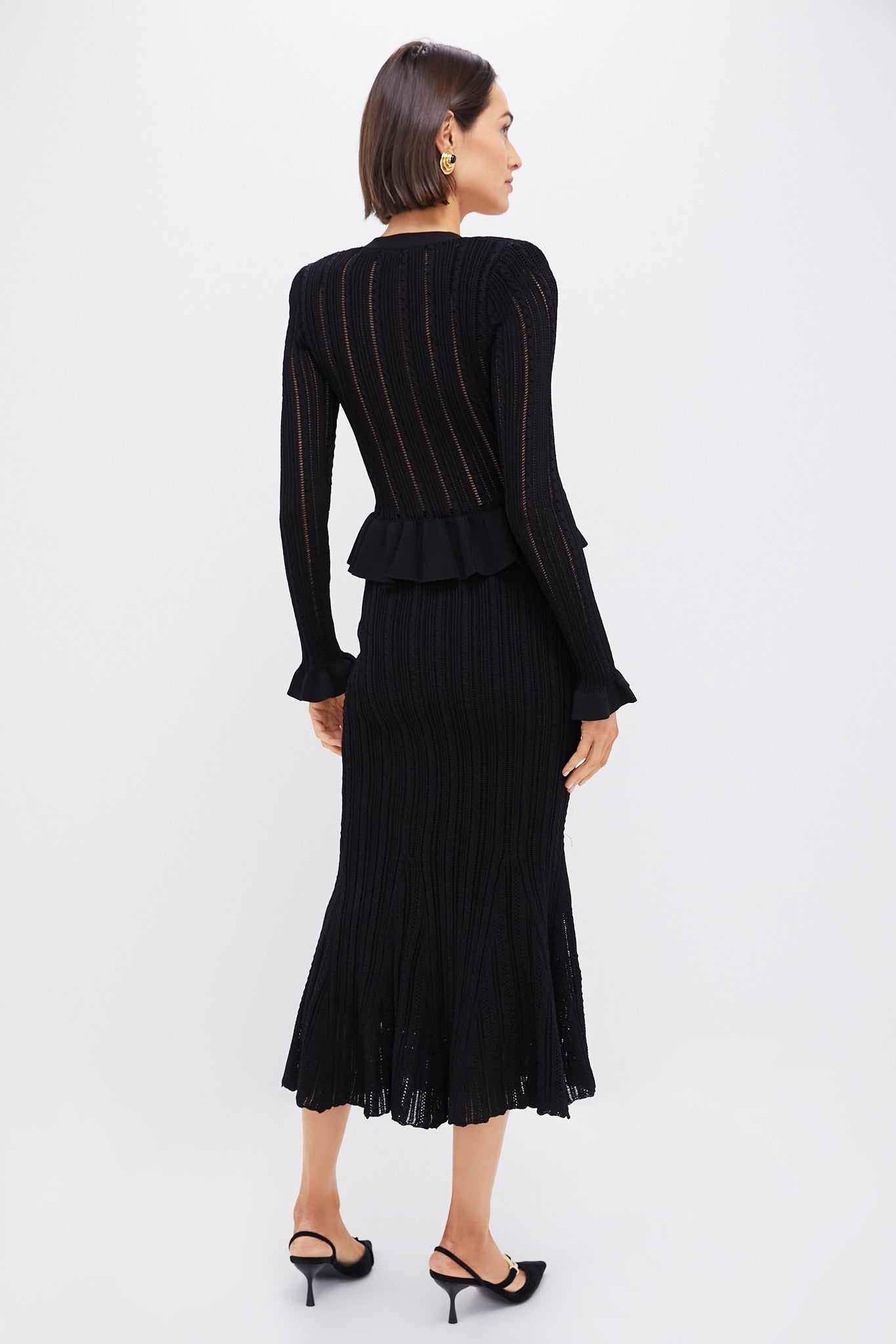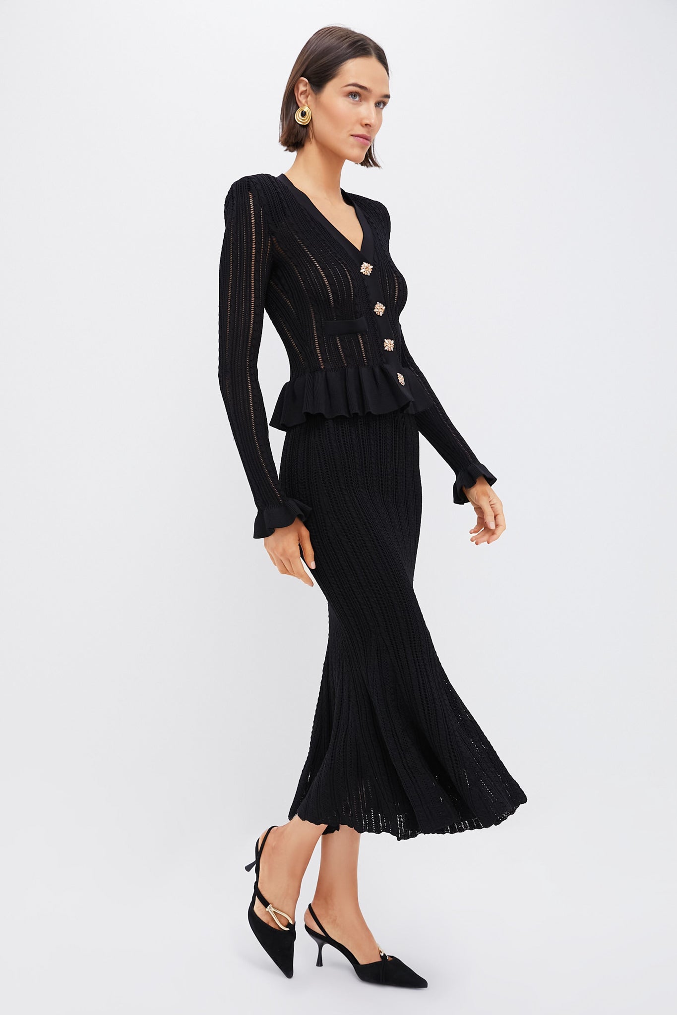 The one-and-done option for every occasion. this midi dress is cut from a chic black pointelle knit. A peplum waist detailing flatters the form while the intricate gold buttons add vintage charm. Pair with black heels and gold earrings for a high-fashion look.