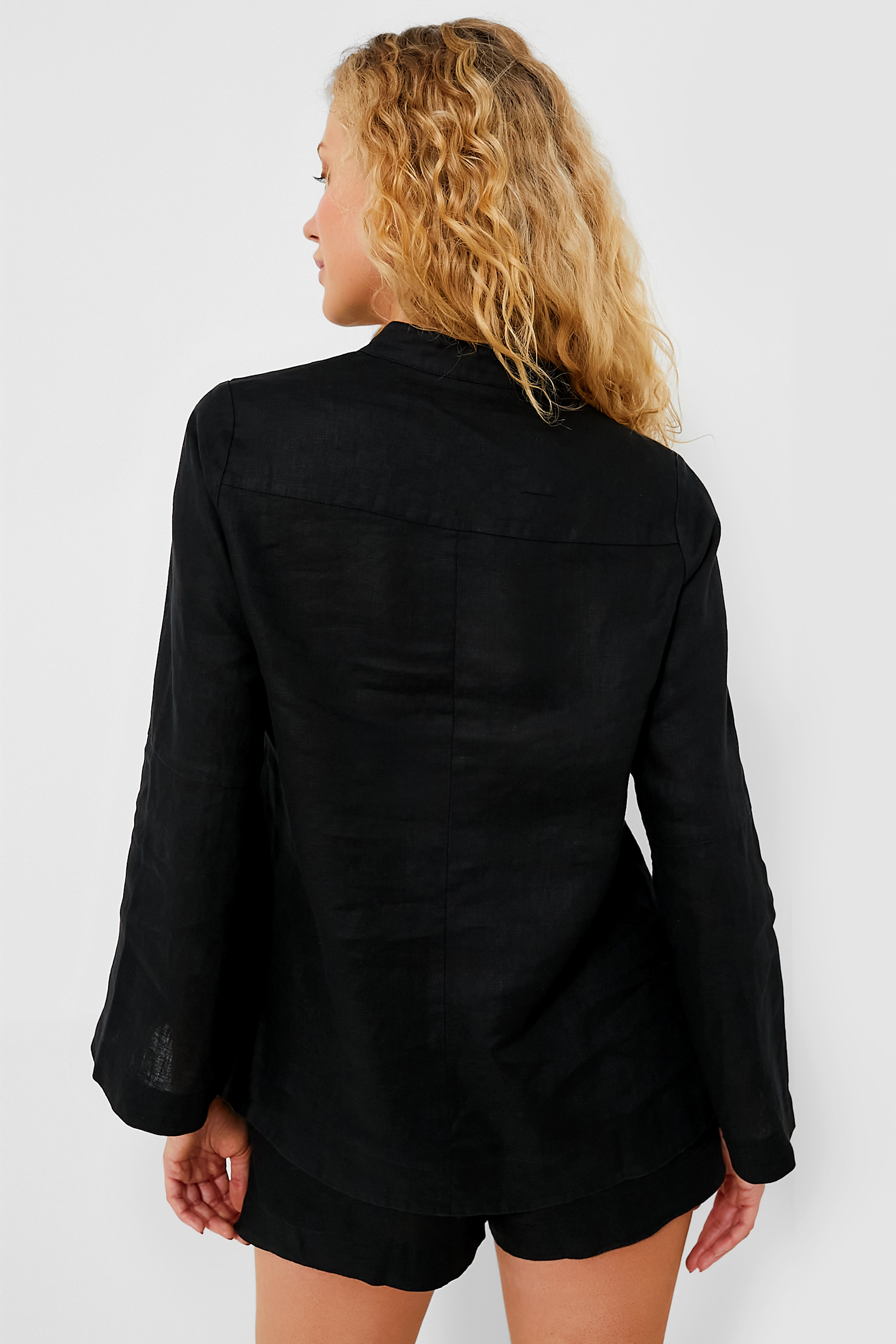 Introducing the Linen Tatum Popover- a breezy top that you can easily dress up or down for countless occasions. This blouse features long bell sleeves. a mandarin collar with a V-notch. and a two-button placket. Pair with trousers and ballet flats for work. or with the matching Linen Elena Shorts and sandals for a casual weekend look.