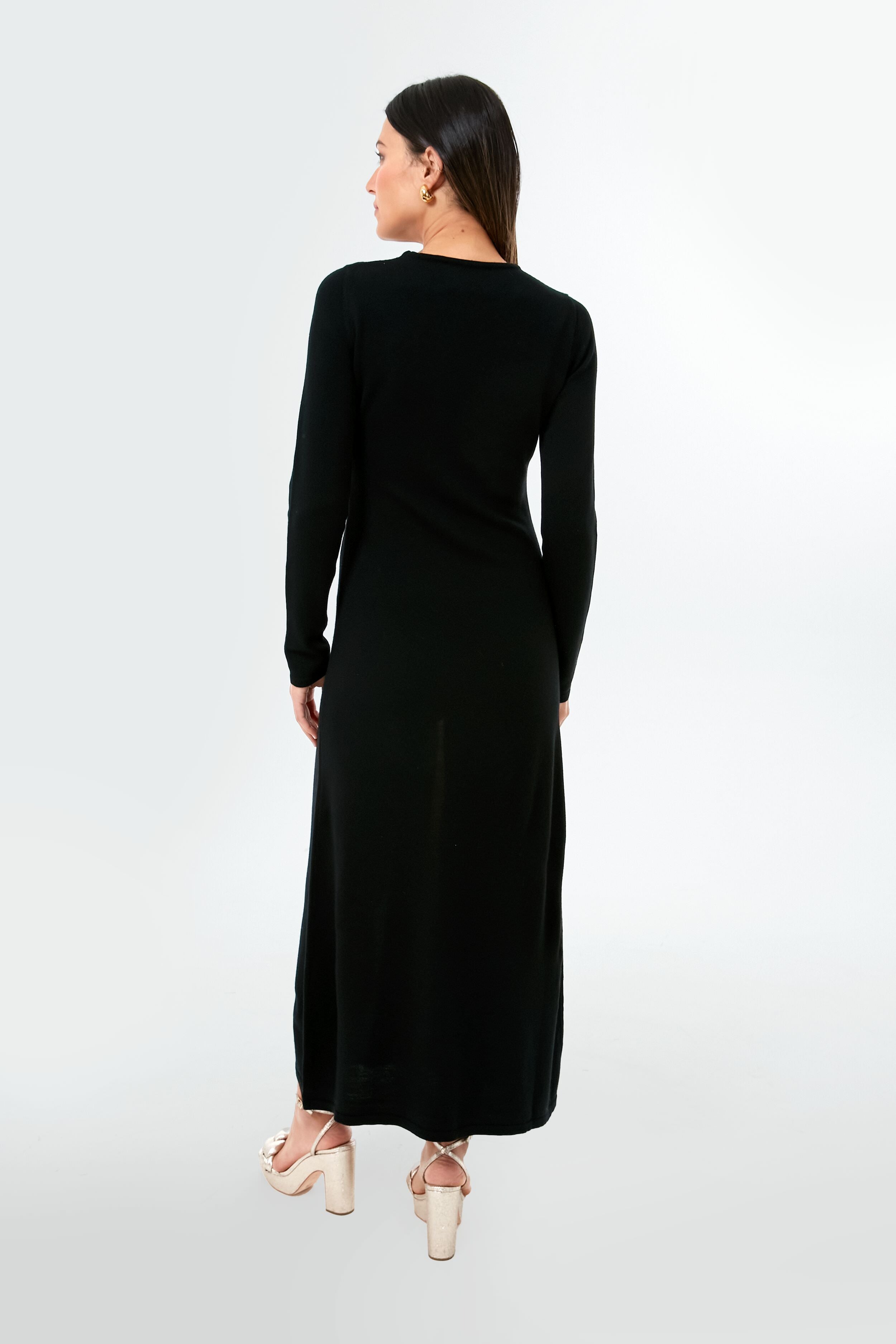 It's no wonder the Black London Knit Dress has become a favorite of ours—it is sleek. chic. and oh-so-comfortable. An elegant column silhouette made from luxurious extrafine merino wool. this stunning maxi is brightened by the elongating vertical stripes that run down the front of this beautiful go-to style. Perfect for wearing from day to night. this style looks just as polished with white sneakers as it does with heels!