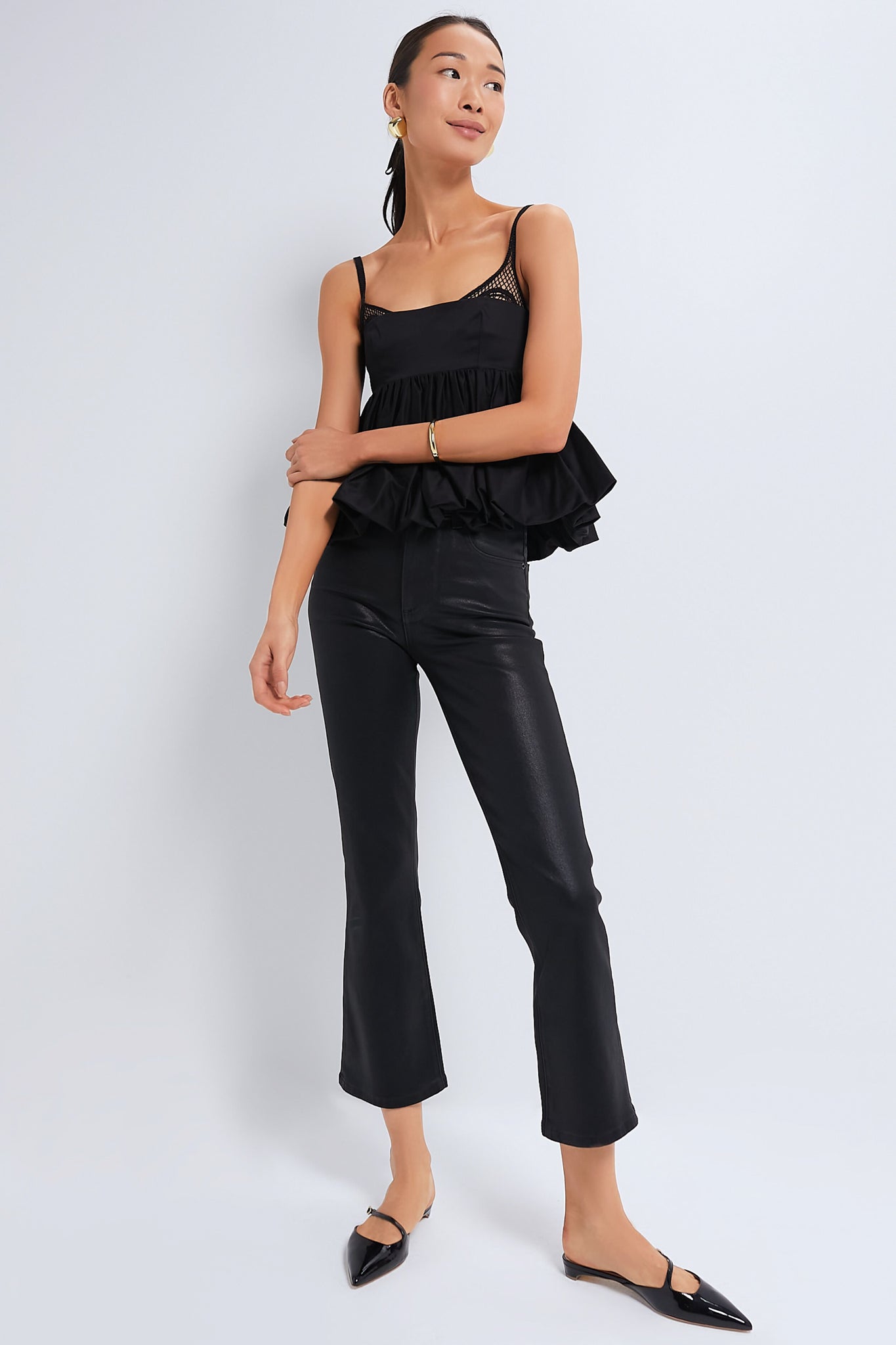 The Black Mimi Peplum Top is highlighted by its intricate crochet detailing along the neckline and shoulder straps. Designed to flatter. it boasts a fitted silhouette through the bodice that seamlessly transitions into a voluminous bubble peplum. Pair it with a skirt or jeans with gold jewelry for a show stopping night out look.