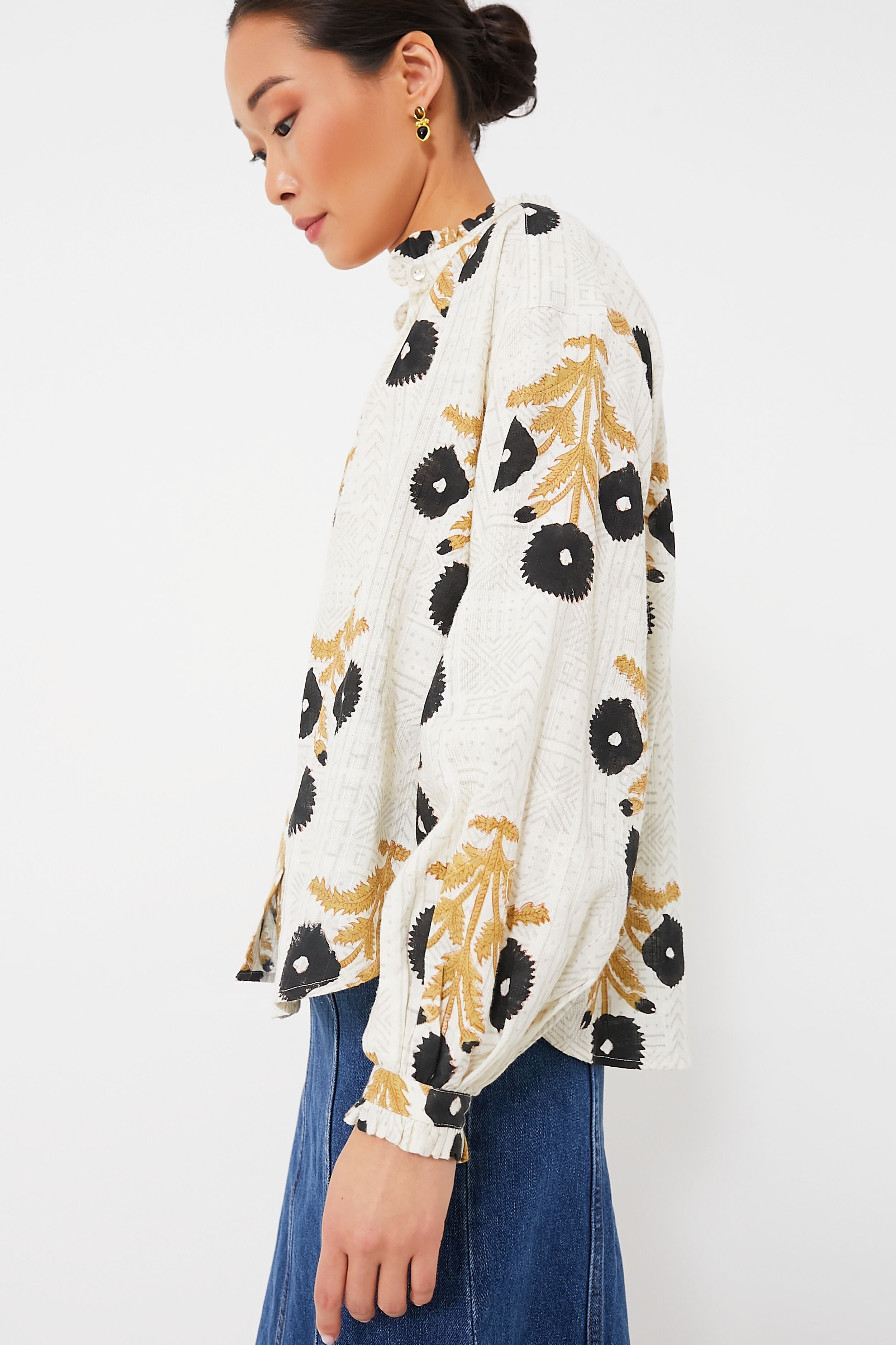 Blooming with earthy hues and hand-block printed flowers. the charming Black Noir Triple Bloom Blouse is a staple in any season. Finishing touches include a ruffle details on stand collar and cuffs. mother of pearl buttons down the placket. and a floaty fit that all come together to create an understated but elegant top. Made of lightweight and breathable cotton. this style is beautifully paired with trousers for an elevated ensemble or tried-and-true denim for a retro-inspired boho-chic look.