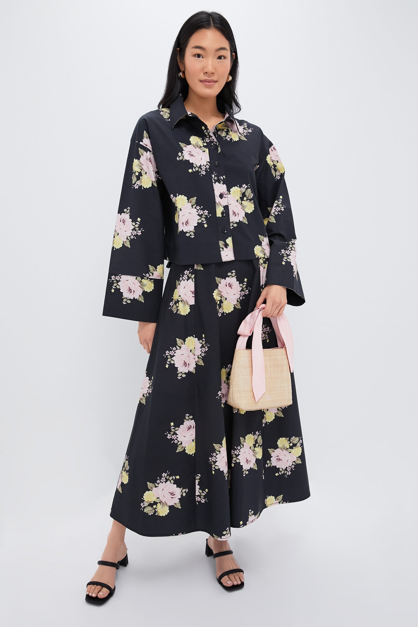 This romantic style is a classic A-line skirt decorated in rosy pink florals. A timeless look perfect for special occasions. we are styling it with heels and the matching Black Posy Poplin Cropped Shirt for a coordinated ensemble!