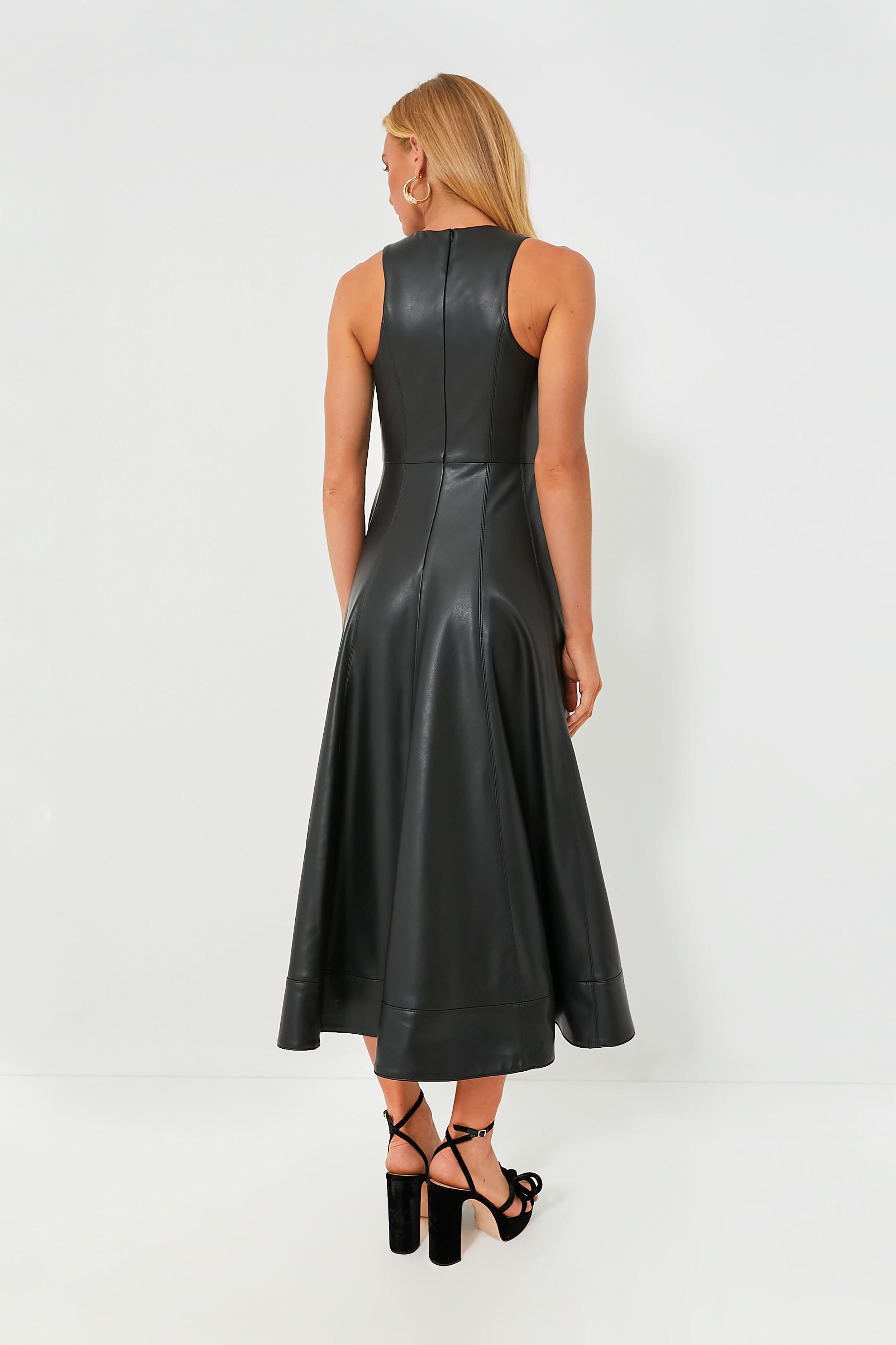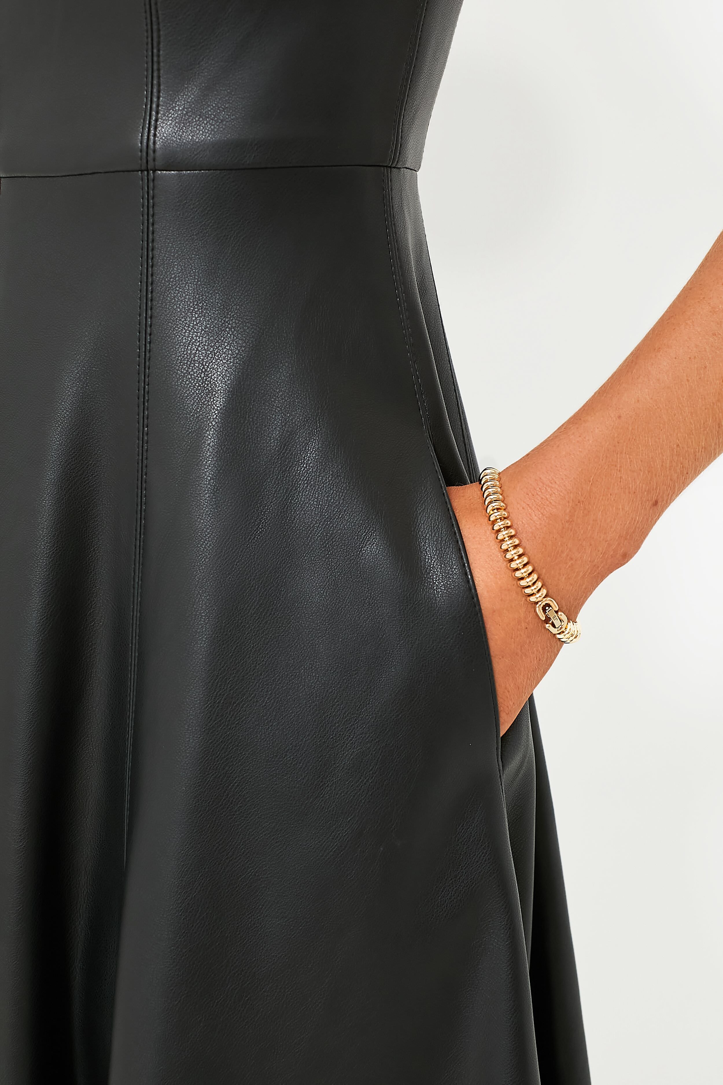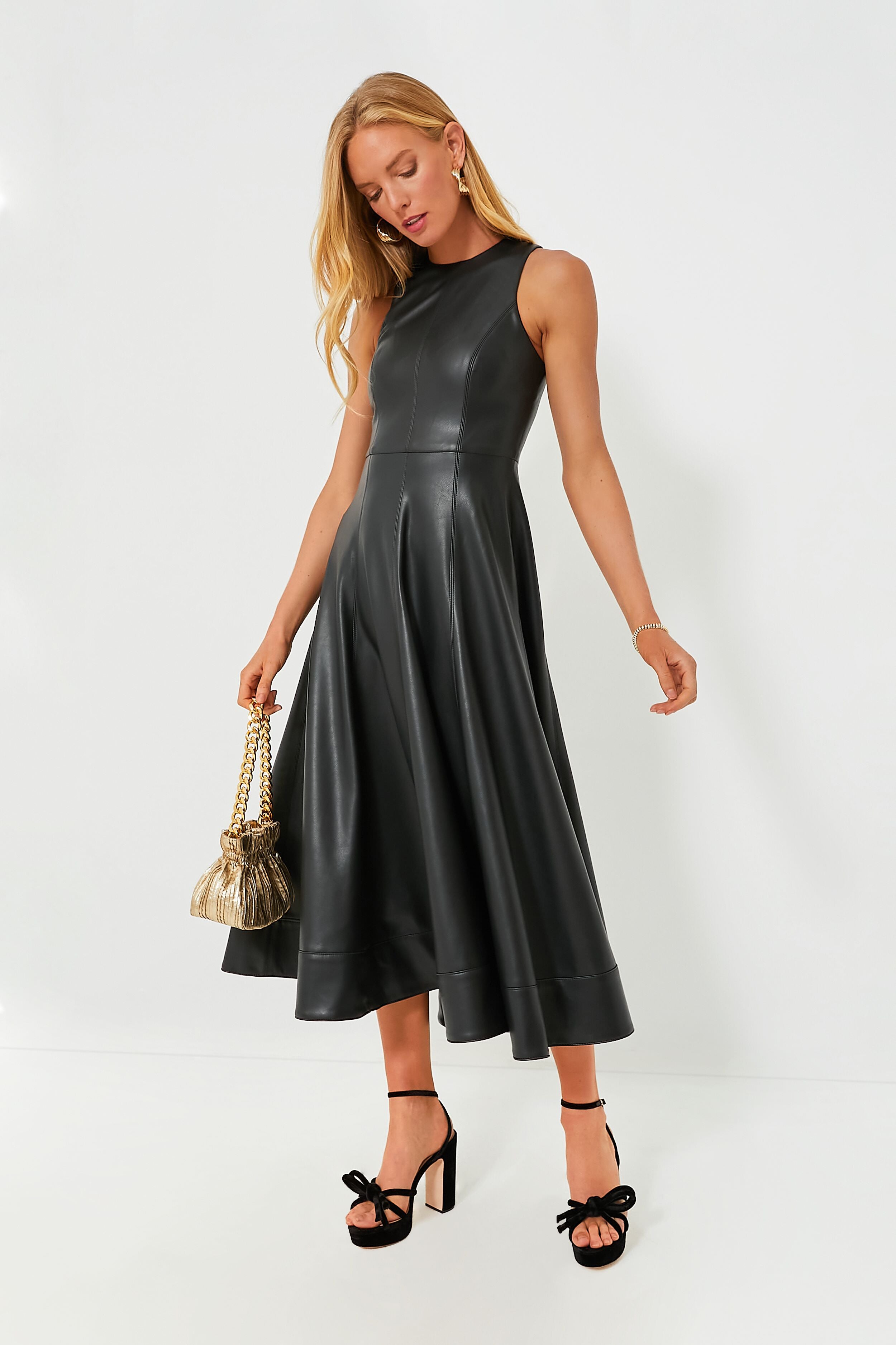 Look beautiful and chic with the Soline Dress. Crafted with vegan leather. it features a classic A-line midi silhouette with a crewneck. fit to flare design. along with pockets for a touch of modern style. Perfect for all seasons. we are styling this dress with a chunky gold necklace. black block heels. and a clutch purse for a striking date night outfit.