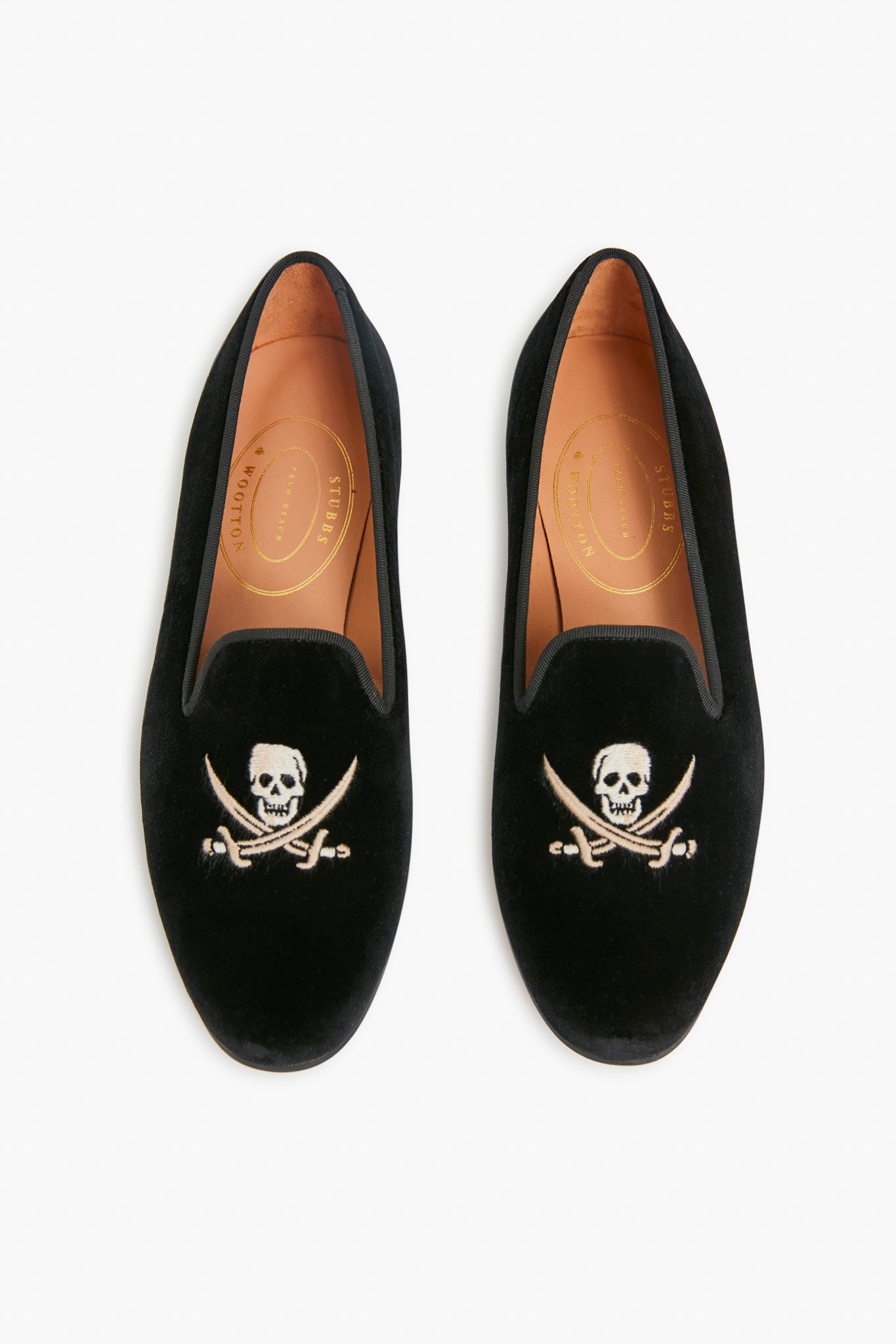 The Black Velvet Skull Slippers feature a grosgrain ribbon trim and Jolly Roger design. Handcrafted in Spain. these are leather lined to provide additional support and comfort. Pair with denim and sweaters for a cozy look this season.