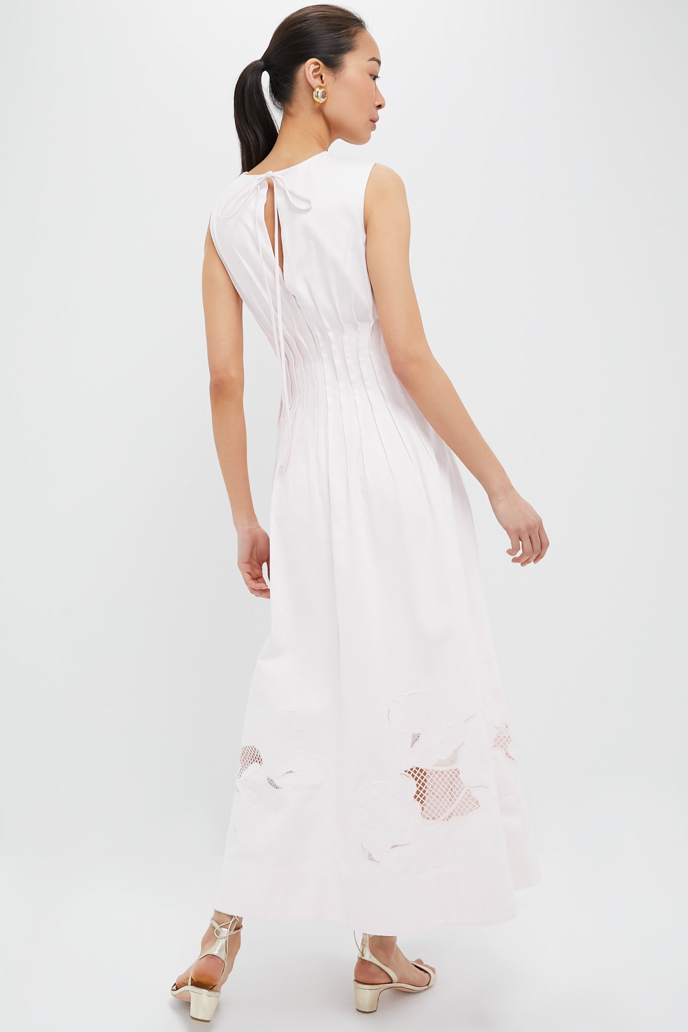 Elevate your wardrobe with the Blossom Anika Embroidered Dress. a memorable statement piece. Crafted from a crisp cotton fabrication this midi dress features intricate pintuck detailing contouring through the waistline before falling into a full skirt. Bespoke embroidery adorns the skirt hemline featuring floral motifs. lattice lace detailing and intricate cut work. We styled this work of art with heels. gold jewelry. and a clutch for an effortless look.
