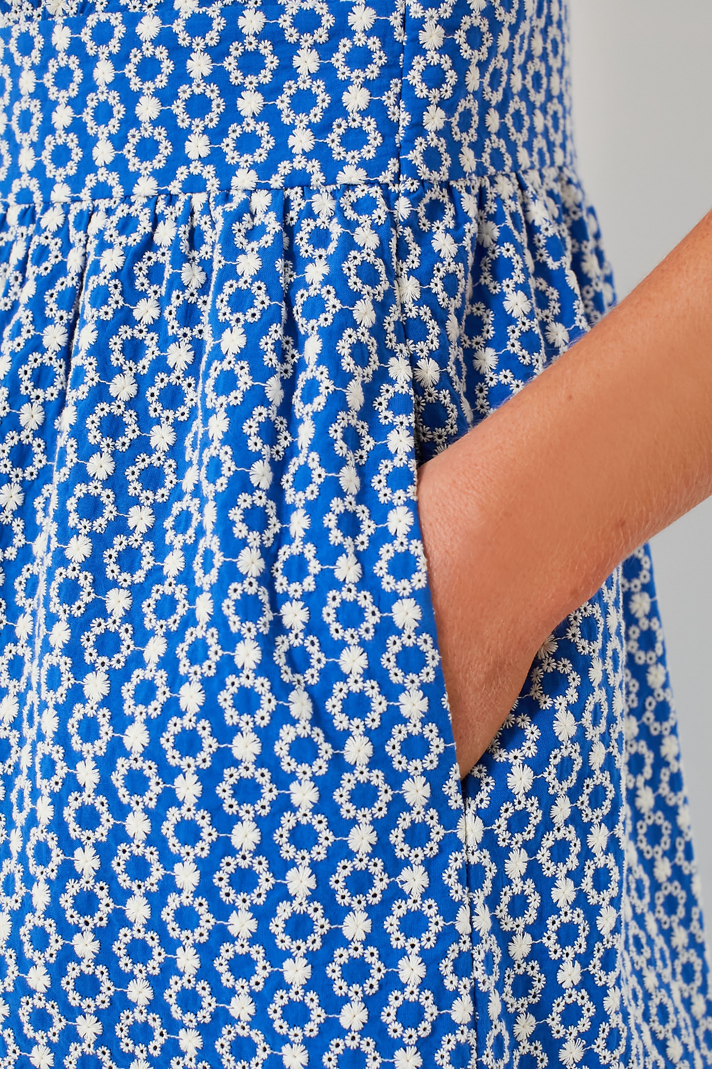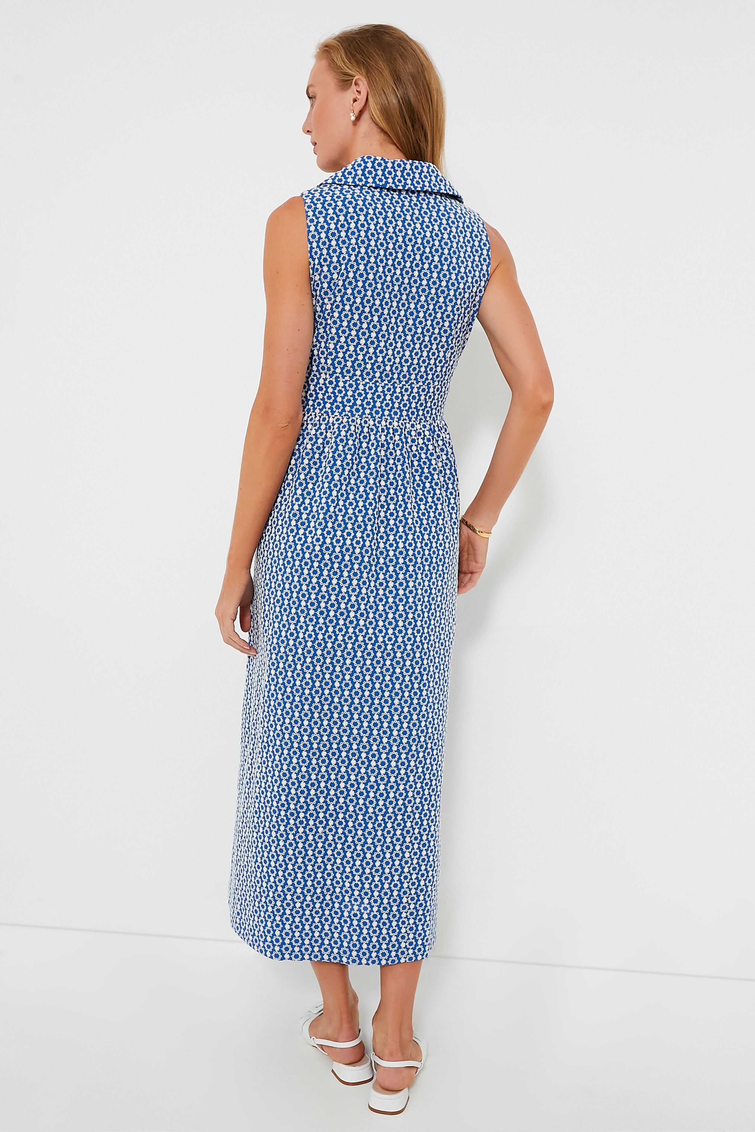 In search of the perfect tailored piece to get you through the warm weather? Look no further than the Blue Eyelet Sleeveless Noelle Dress. Polished to perfection with it's notched lapels. covered buttons. and fit-and-flare silhouette. this maxi checks all the boxes. From sandals to sneakers. heels to flats. we are constantly reaching for this number for easy day to night transitions. desk to drinks. and everything else all season long.