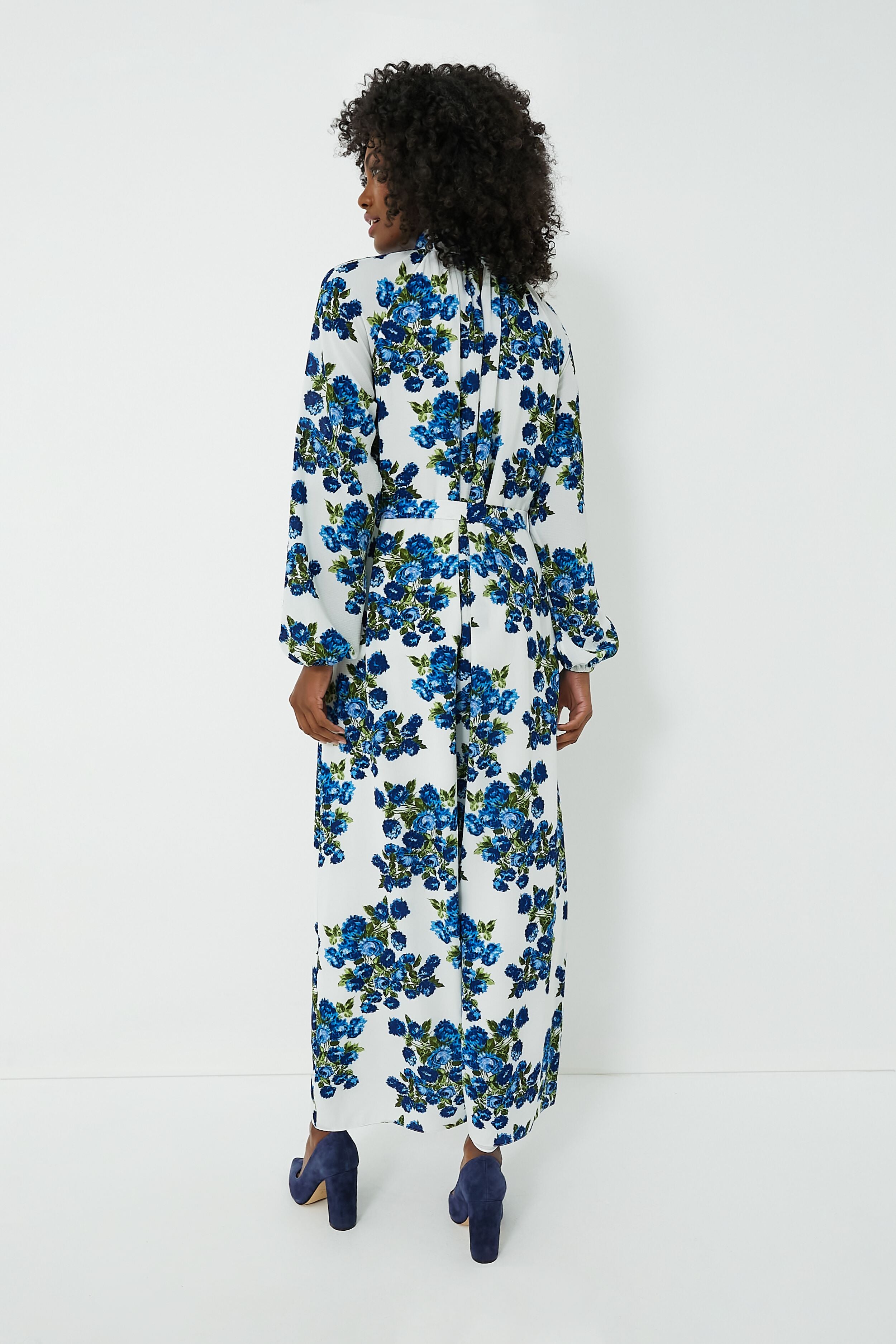 Beautifully crafted for an alluring look. the Elanda Dress features charming blue florals printed on lightweight crepe georgette. Effortlessly elegant with plenty of freshness and femininity. this maxi features a mock neckline that buttons at the back. billowy blouson sleeves. and a self-tie belt to cinch the waist and create your perfect fit. Complete your look by adding heels and statement earrings. then you are easily event ready!