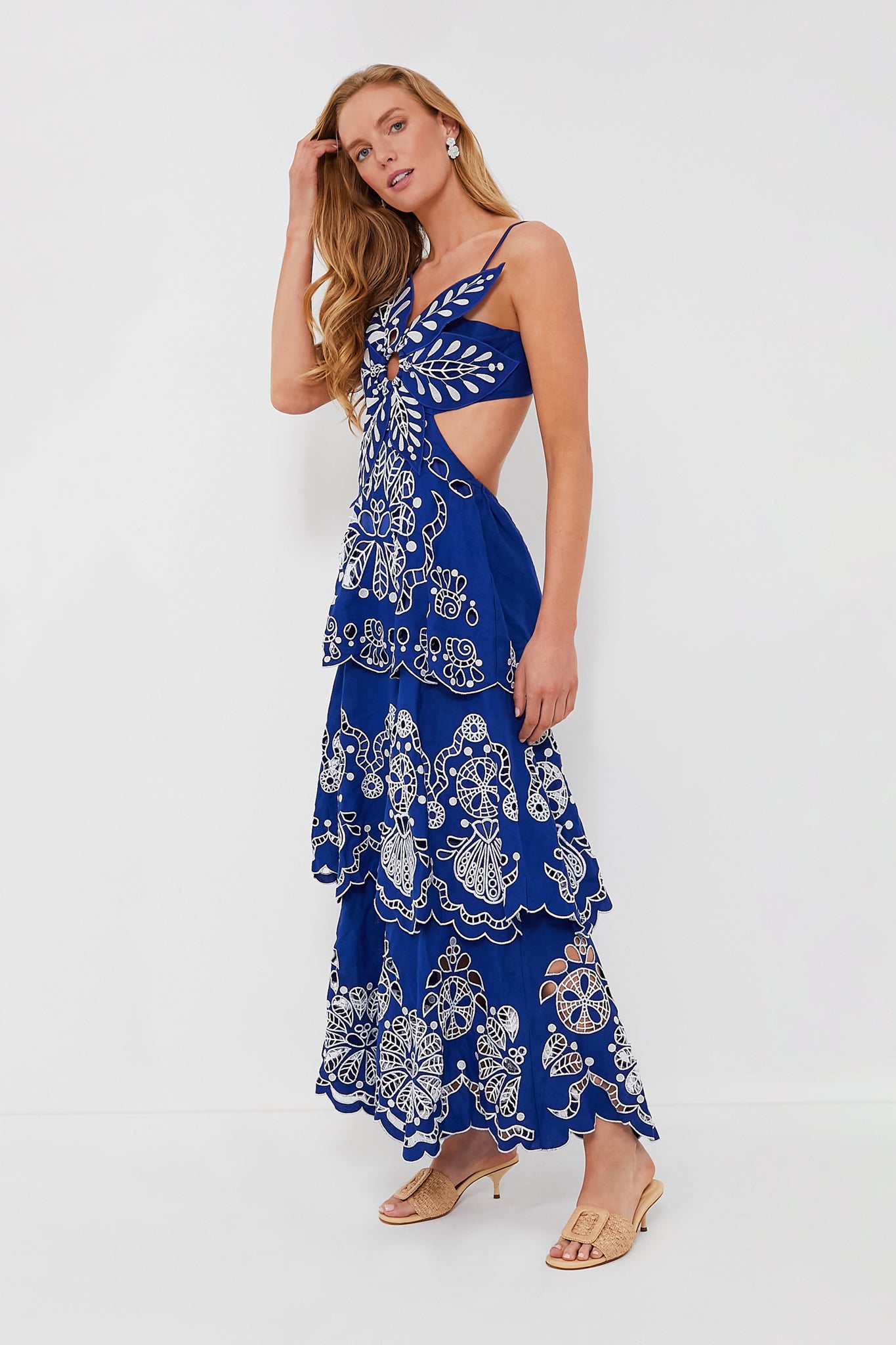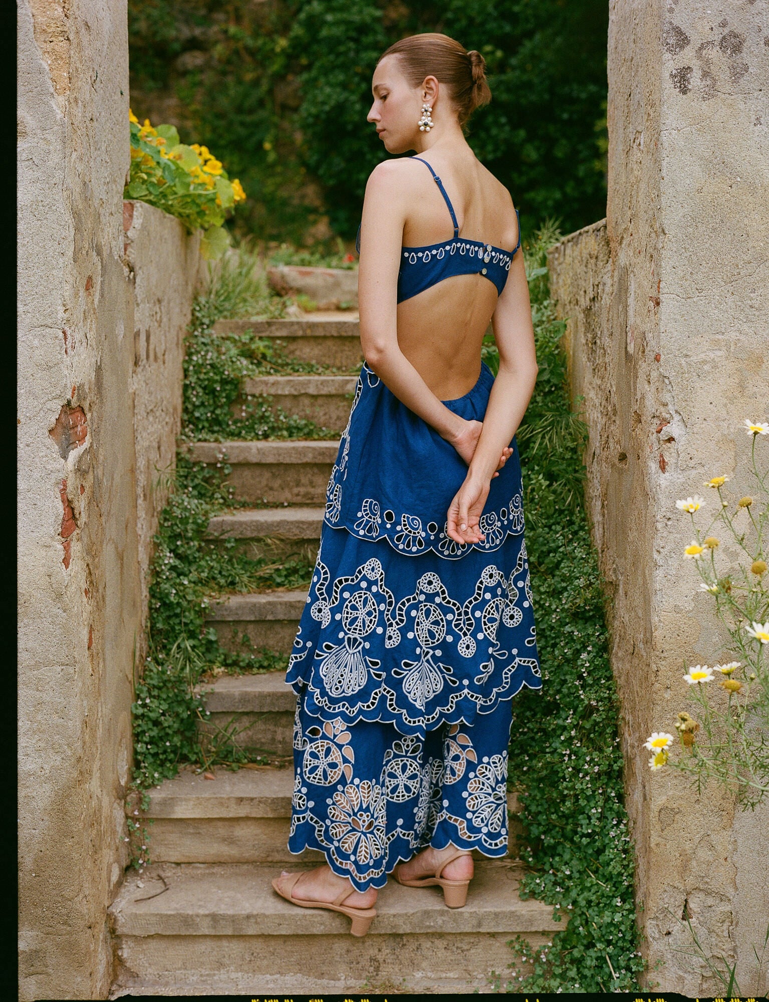 Embrace the allure of the Blue Flower Richelieu Midi Dress. featuring a captivating asymmetrical neckline that adds a touch of uniqueness. Adorned with intricate white embroidery and three-dimensional cutouts on a deep blue linen canvas. this dress exudes a relaxed yet sophisticated vibe. Pair with raffia heels and a clutch for a show-stopping event look!