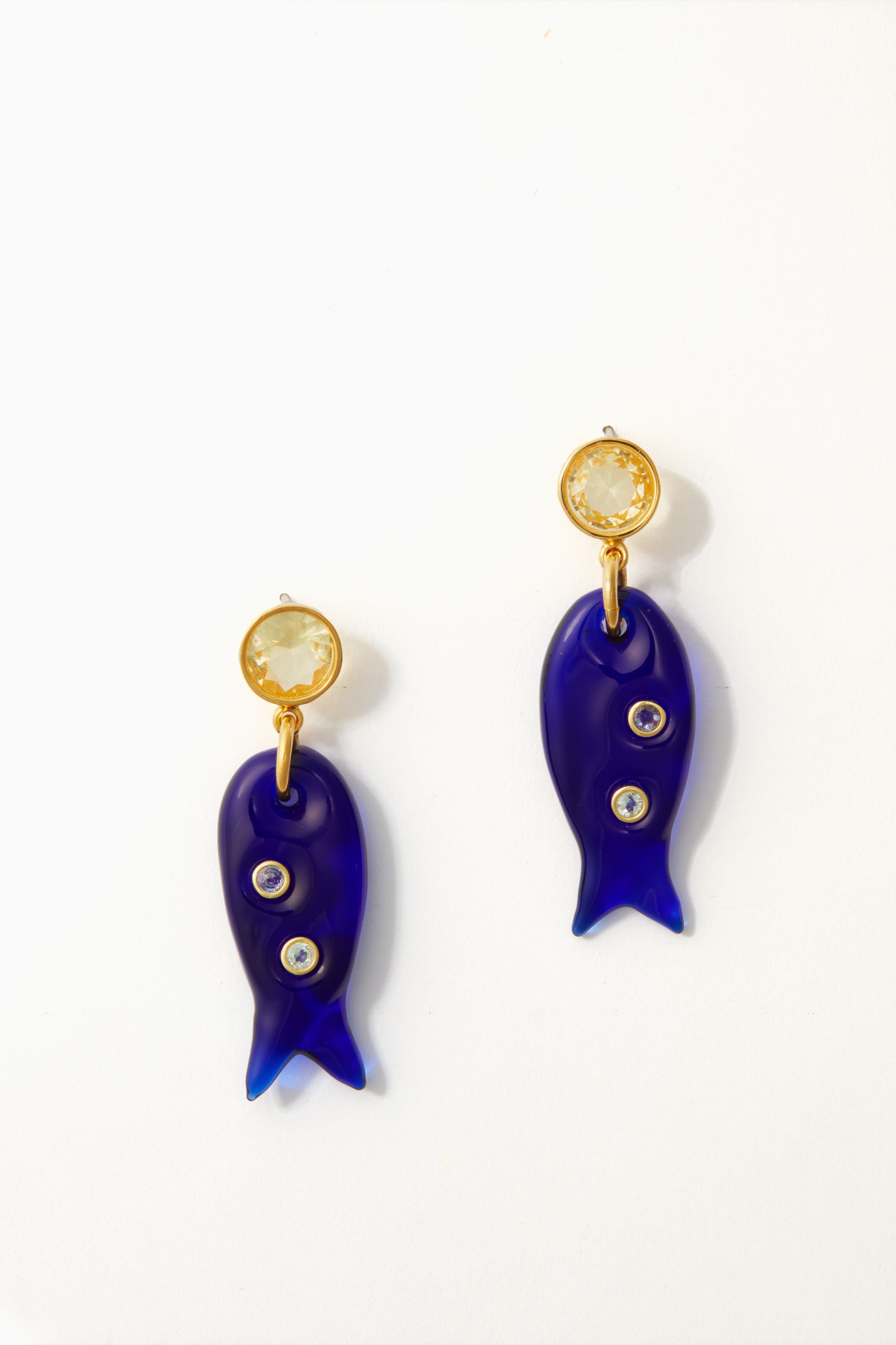 We've fallen for these unique and playful earrings– hook. line. and sinker. With citrine-colored faceted glass tops and cobalt glass fish drops. inlaid with tanzanite and sky blue topaz stones. the Blue Fresh Catch Earrings are truly special. Effortless enough to wear everyday. we are styling these with everything from denim and a tee to boho maxis!