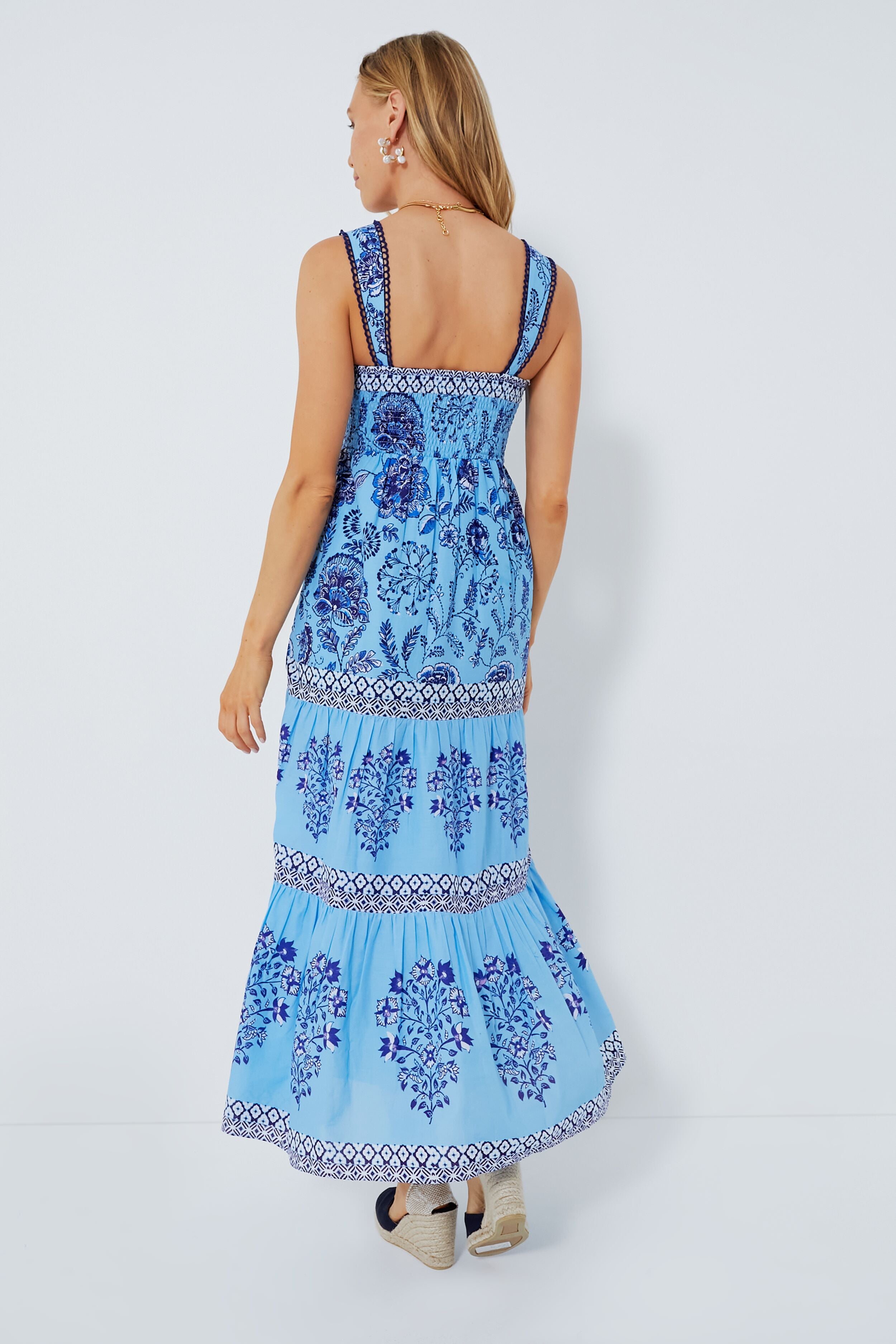 A playful yet statement-making style. the Blue Hebe Dress boasts stunning florals in vibrant hues. Featuring a square neckline. a smocked bodice. and a tiered skirt with contrast trim. this beautiful midi is endlessly versatile. Take it on vacation. wear it to an event. or grab a quick lunch with friends without having to change outfits — just pick sandals and sunnies for casual styling. or go for heels and statement earrings to elevate things!