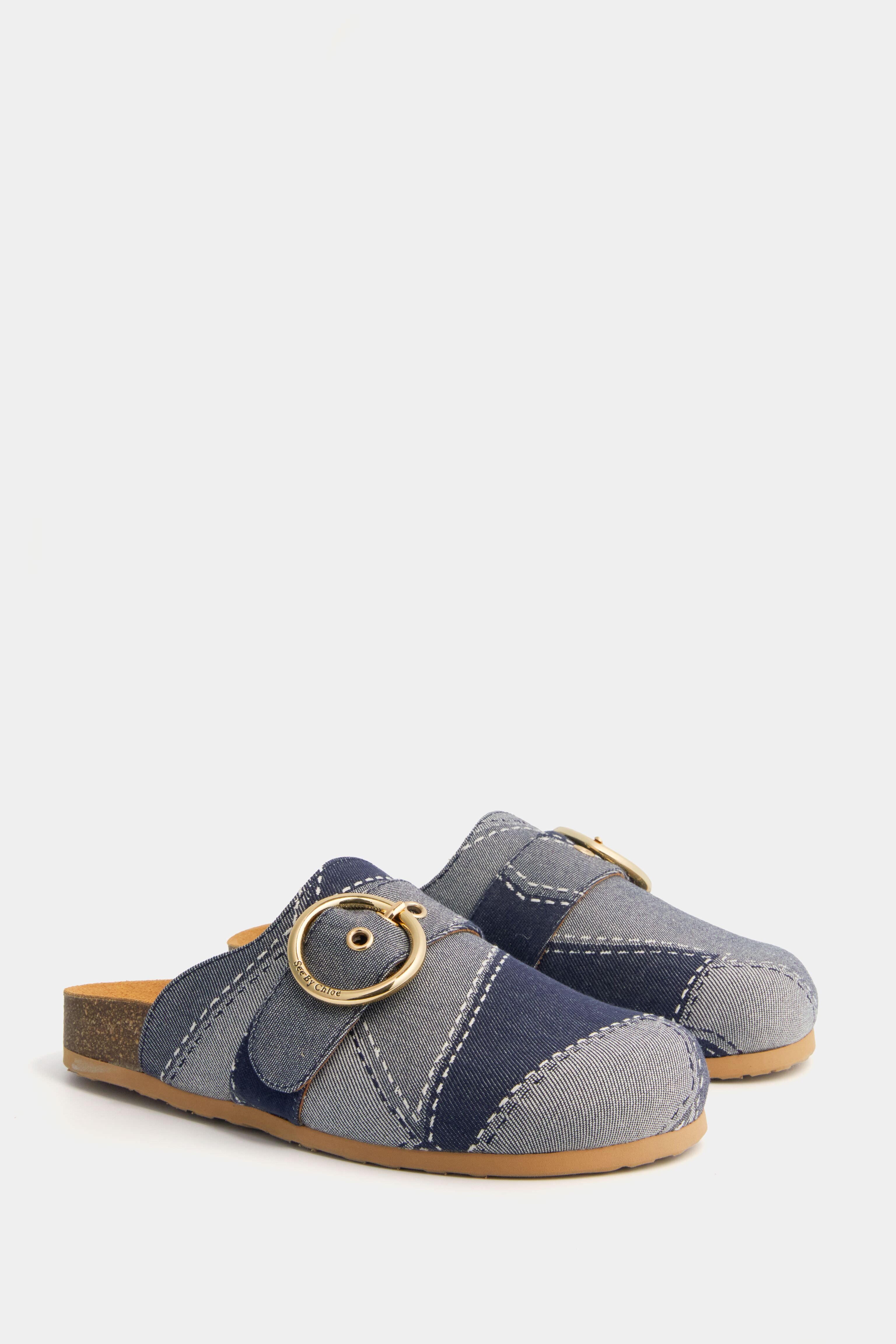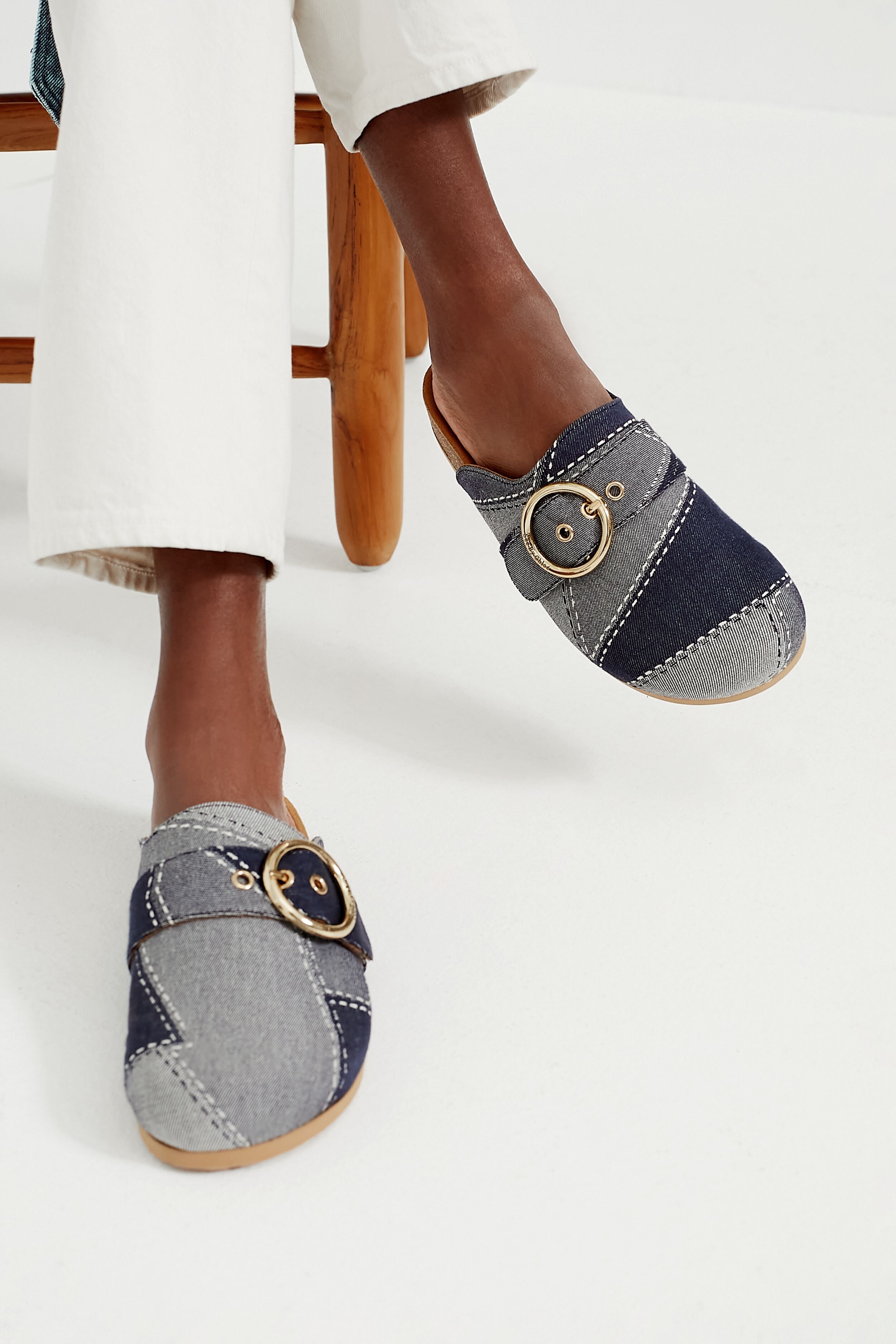 Denim is in. and we are loving these Blue Joei Slides that patchwork fabric in varying shades of blue. A classic slip-on silhouette. these are perfect for casual everyday wear while still adding an elevated element to your ensemble. The cherry on top is the circular gold buckle on the upper strap! Pair with jeans for a monochromatic look. or with a sun dress!