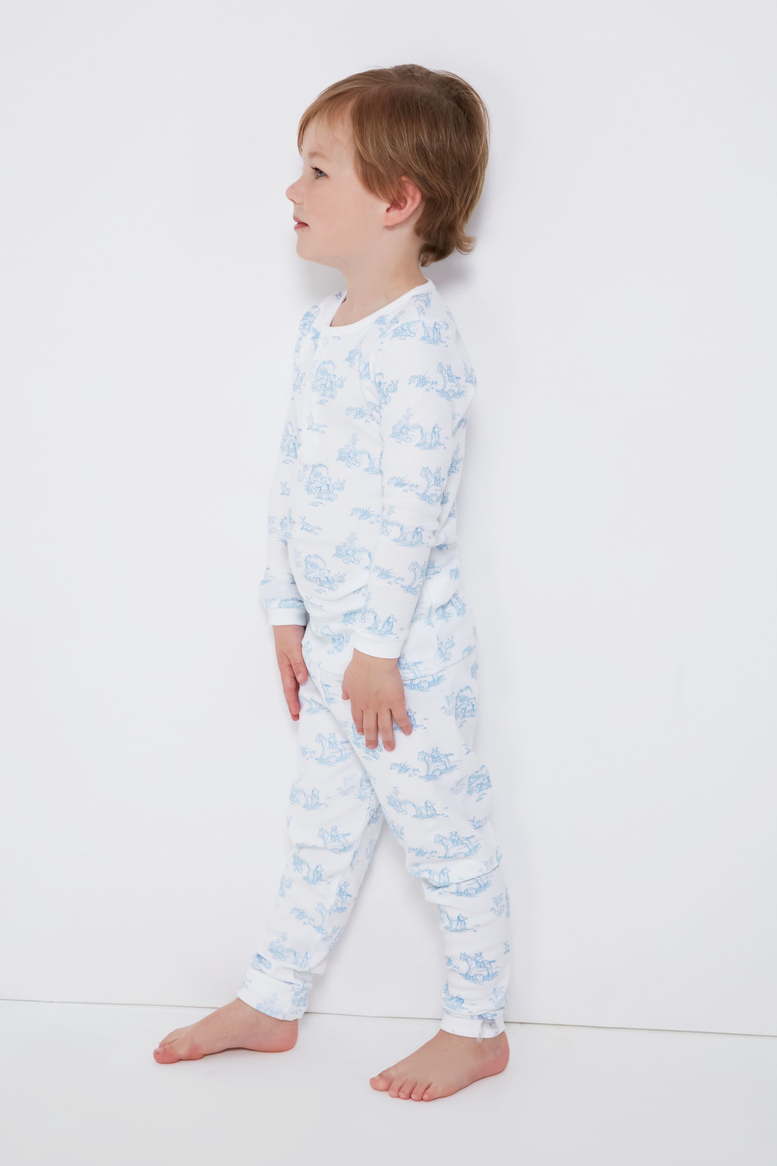 The Blue Toile Baby Pajamas are made from the softest Pima cotton with a bear-printed fabric. The true secret behind the softness and quality of these products comes from the northern coastal valleys of Peru. The properties of this fiber create for a more durable fabric. that gives it its unparalleled luxurious touch that is most desired. Your little one is sure to have sweet dreams in these cozy PJs!
