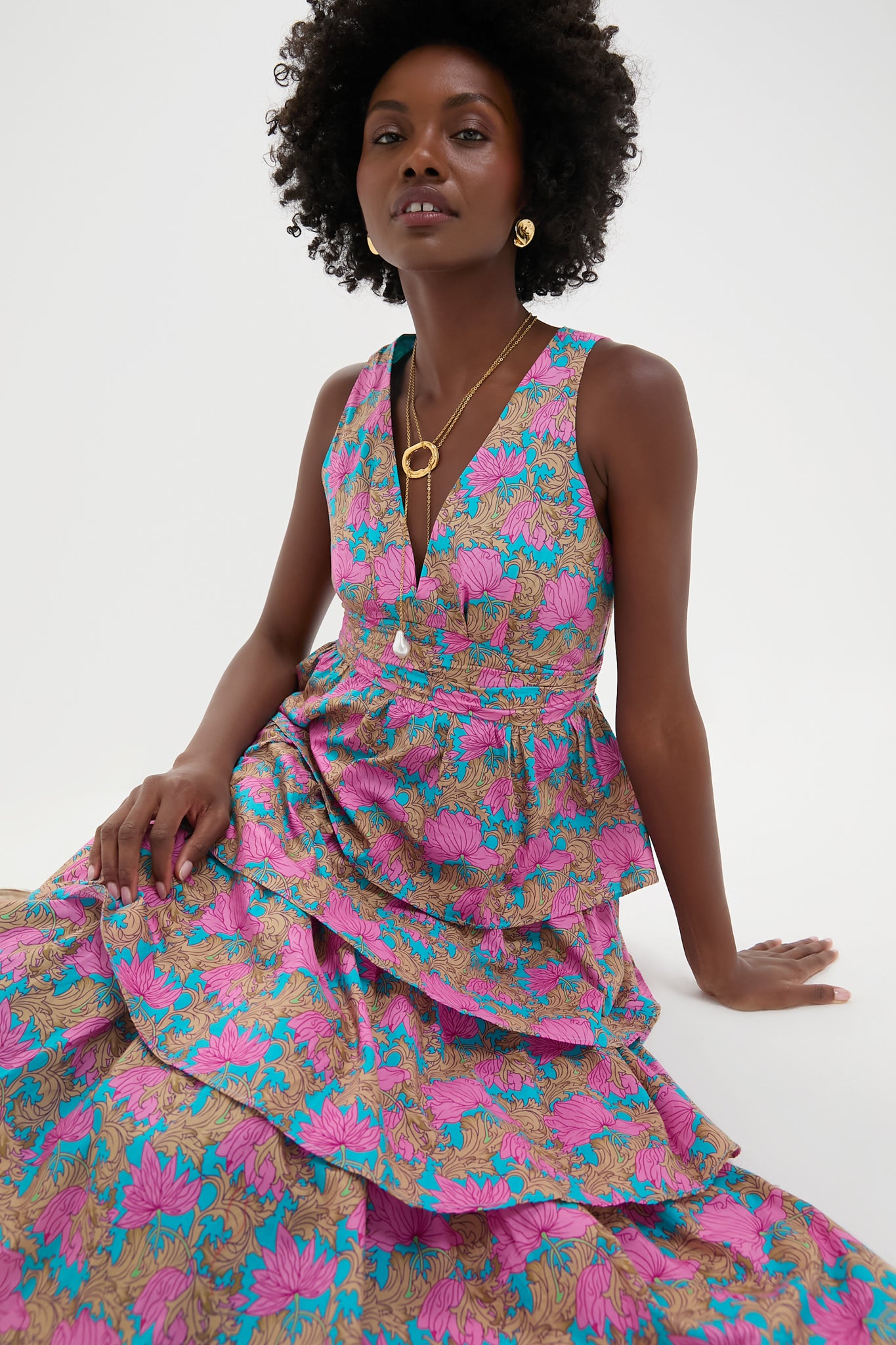 Flirty. floral and frills - what's not to love about the Brilliant Pink Bonnie Dress! With its vibrant print. flattering V-neck. and breezy tiered midi skirt. it's made for al-fresco soirees. weekend brunches. or dancing barefoot at garden parties. Just add strappy sandals and a woven clutch for an ensemble sure to turn heads.