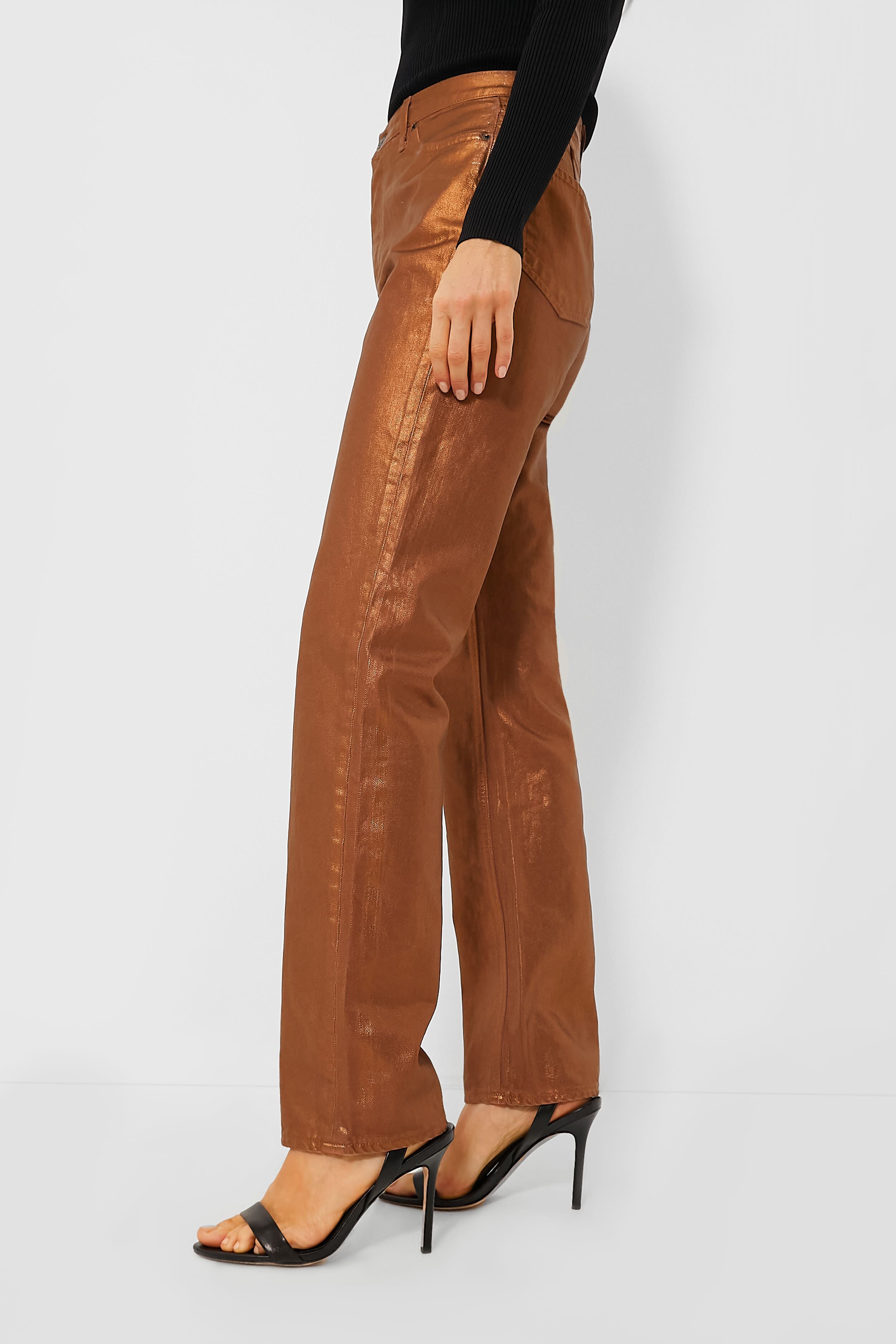 Elevate your denim day with the Bronze Daniela Metallic Pant. Crafted from non-stretch fabric. this high-rise bottom features a classic five-pocket design and a relaxed. straight-leg silhouette. Perfect for festive parties. nights out. or to make a bold statement. they can be dressed down with your favorite graphic tee and booties or dressed up with heels and a silky top for a modern take on glam rock.