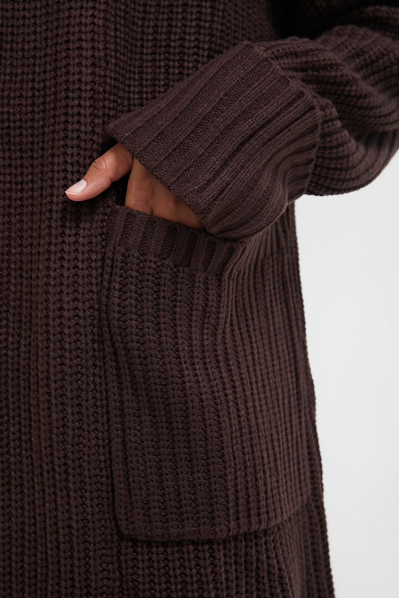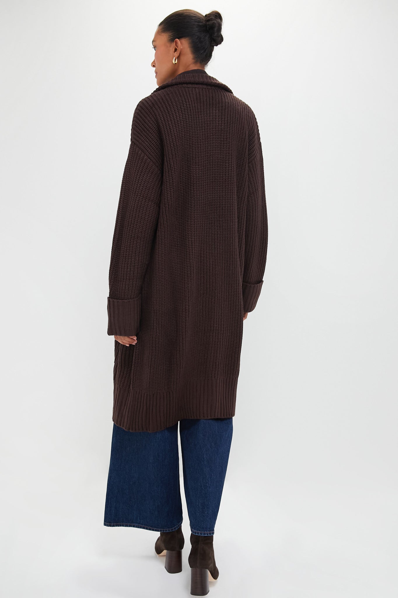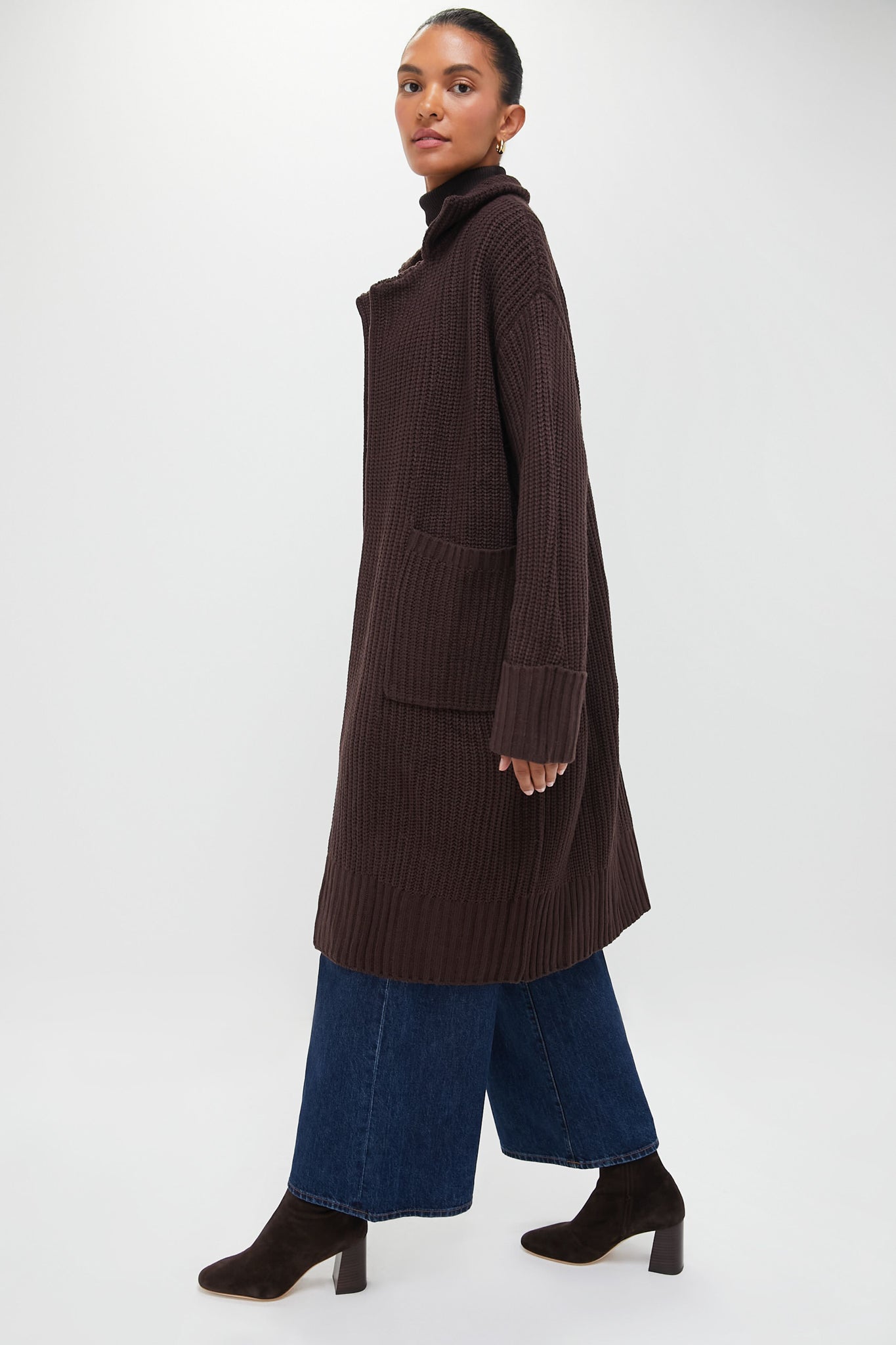 Designed for a relaxed. easy-wearing fit. the Brown Coatigan features a cable-knit texture with a notched collar. long sleeves with oversized cuffs. and patch pockets. We recommend wearing it anywhere and everywhere: in the office. on your next coffee date. running errands around town. or lounging at home.