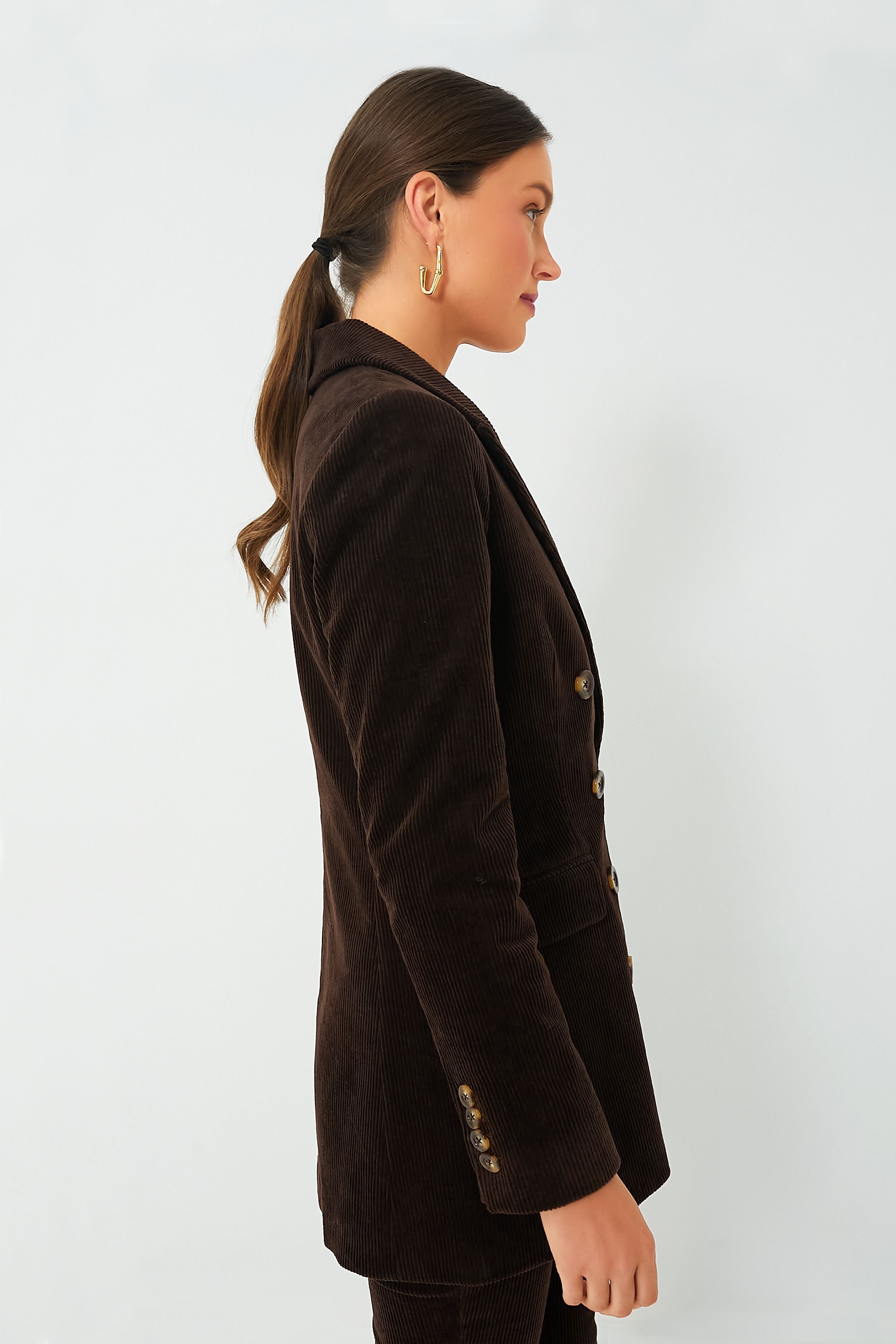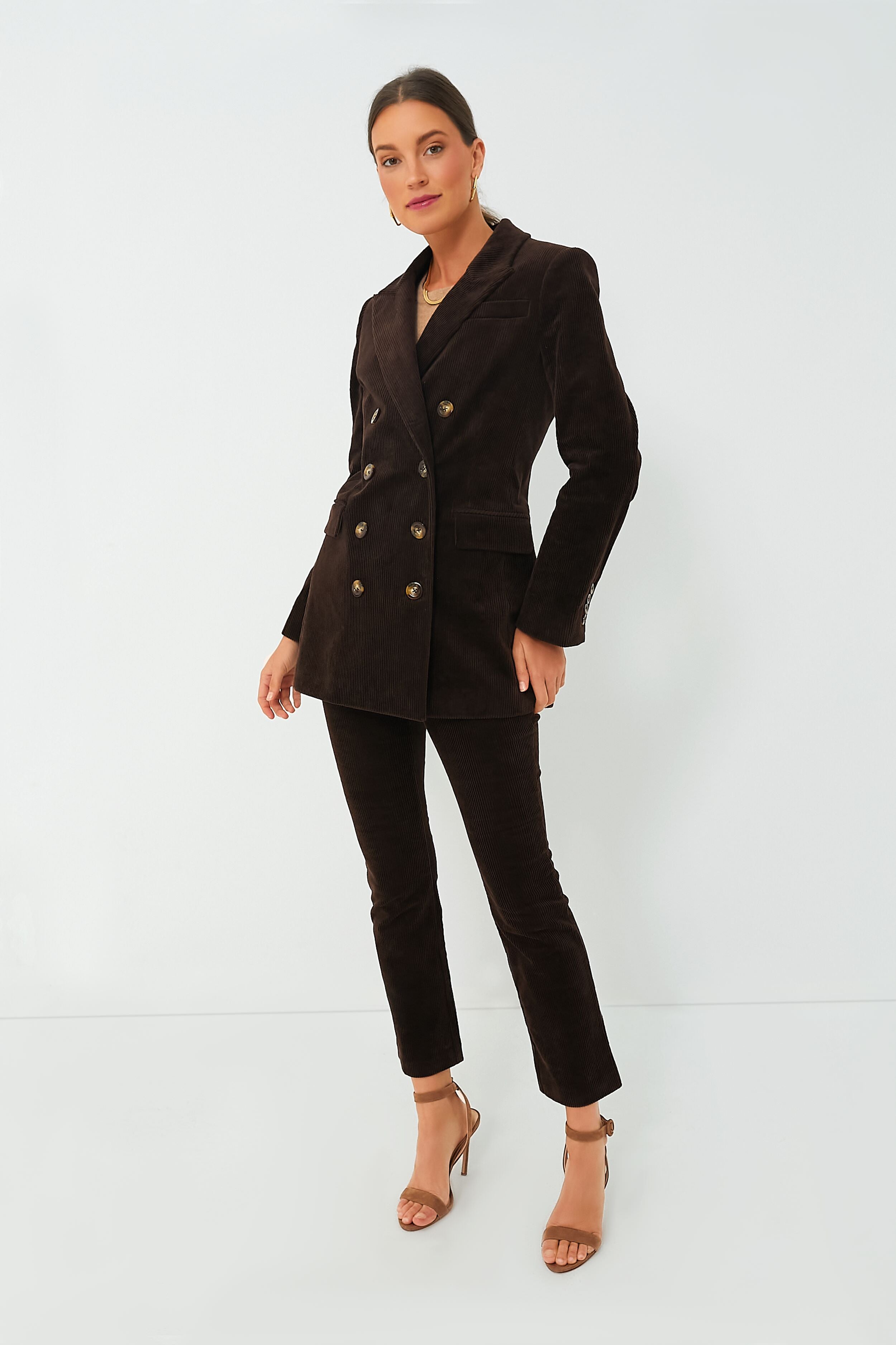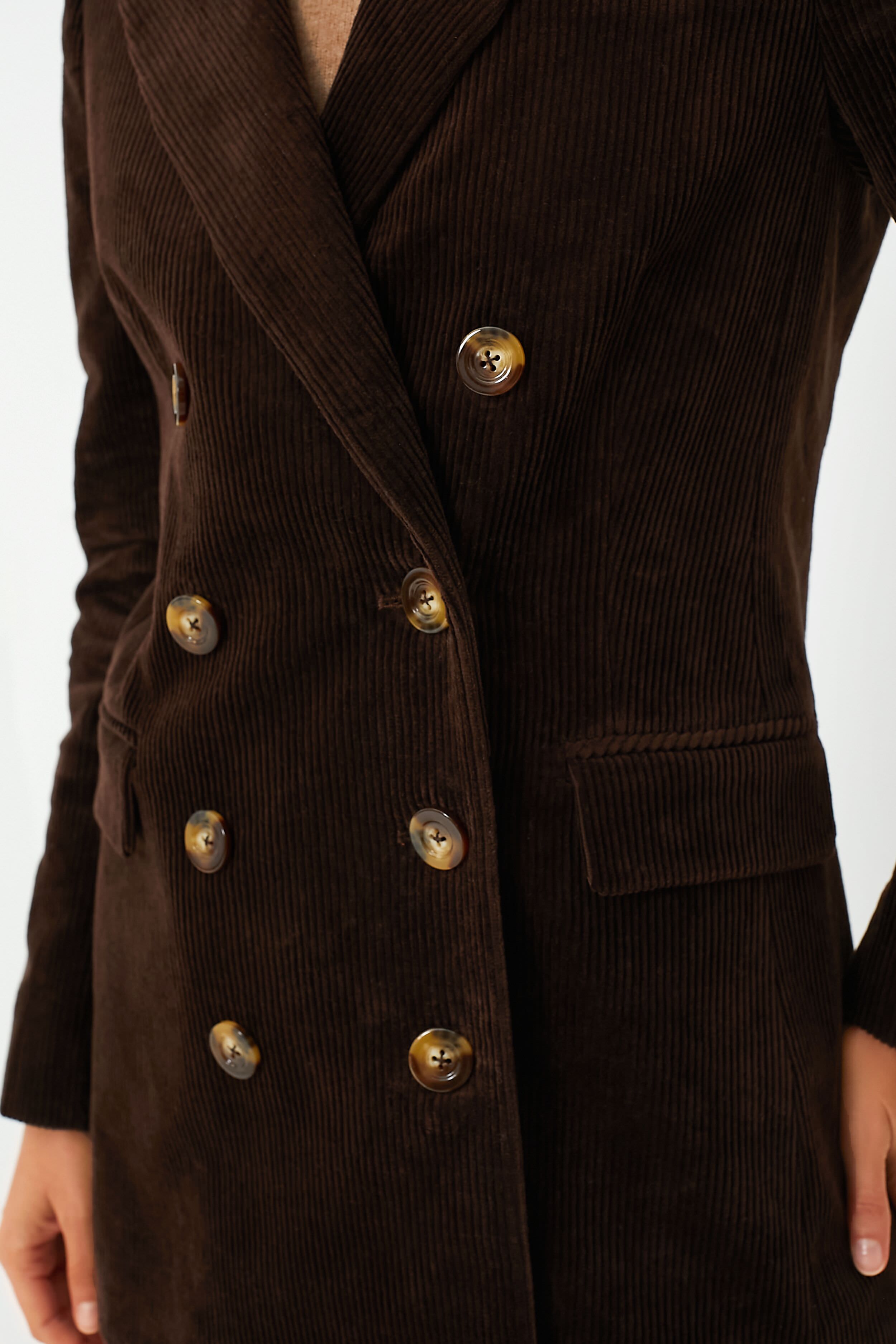 There is nothing better than the Brown Alexander Blazer with its equestrian-meets-prep vibe that's perfect for cooler weather. Made from corduroy in a luxe chocolate color. this chic double-breasted style features peaked lapels. tortoise-shell buttons. and a modern mid-hip length you're sure to love. Pair this elevated outerwear with the matching Ashford Pants for a coordinated look. or layer it over a tee or bodysuit and grab your go-to denim for an effortlessly cool ensemble.