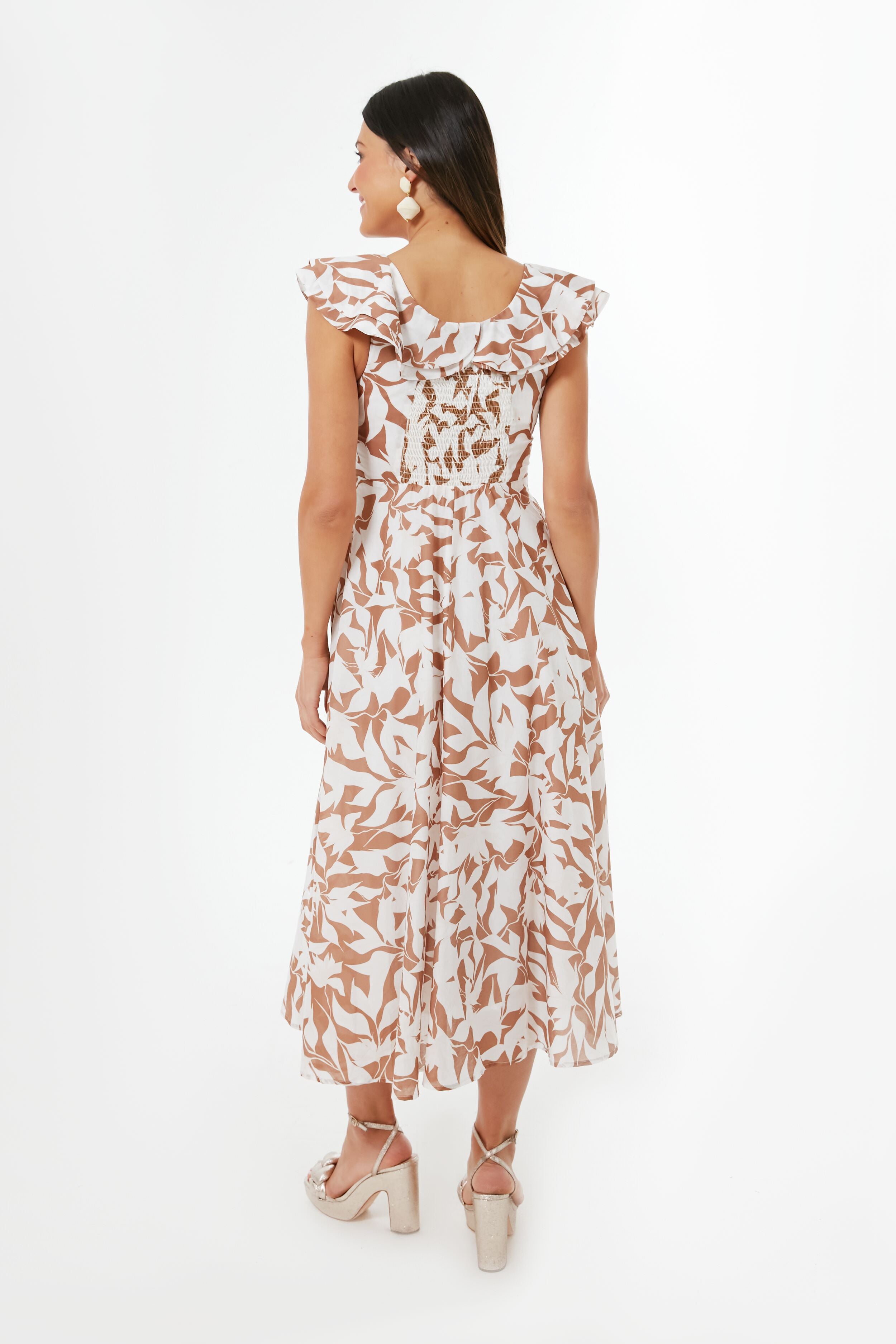 Elevated and daring. we are loving everything the Priya Dress has to offer. In an abstract brown floral print. this maxi features a flattering scoop neckline complete with flutter detailing. a smocked back for the perfect fit. and a flare skirt that effortlessly floats off your body. Pair with heels and neutral accessories to let the dress have it's moment.