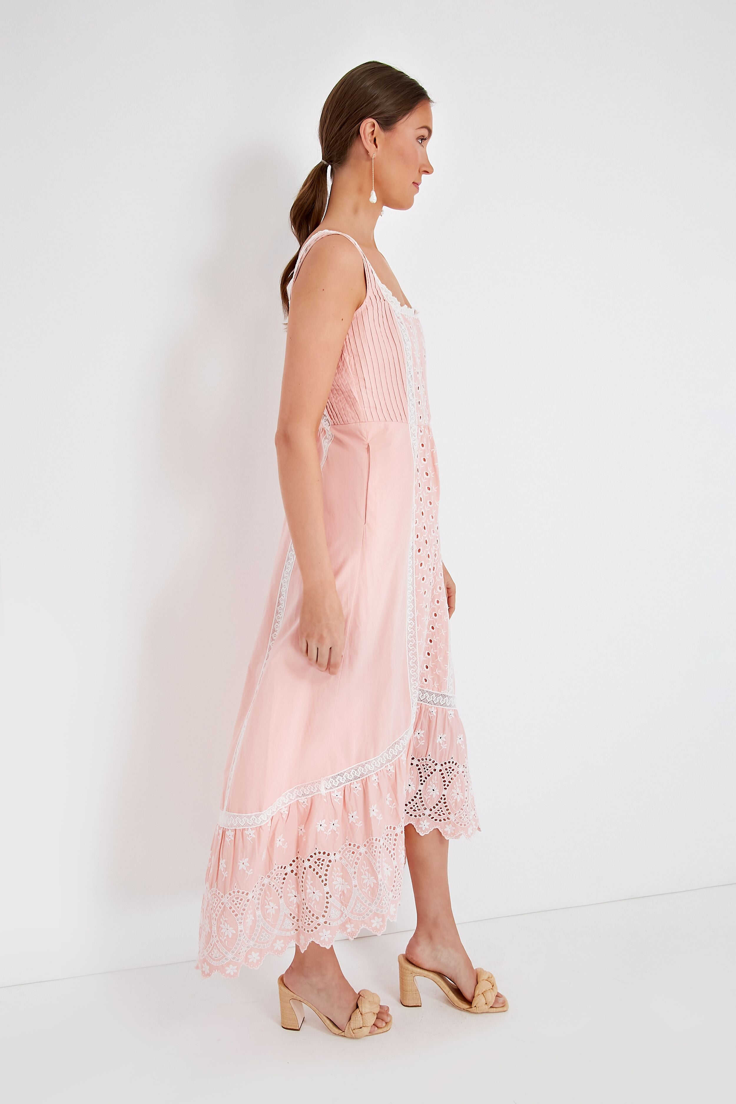 Making a grand entrance with intricate floral embroidery. lace trim. and gorgeous geometric cutwork. the Bubble Bath Alwyn Dress is a springtime stunner. Delicate details like a corset-inspired bodice and a sweeping high-low skirt help this pale pink midi stand apart from the crowd and give it a uniquely feminine style. Pair with wedges and a clutch for baby showers. weddings. and dressy brunches this season. or go for cat eye sunglasses and quirky accessories to dress it down (because we know you'll be looking for excuses to wear it more often)!