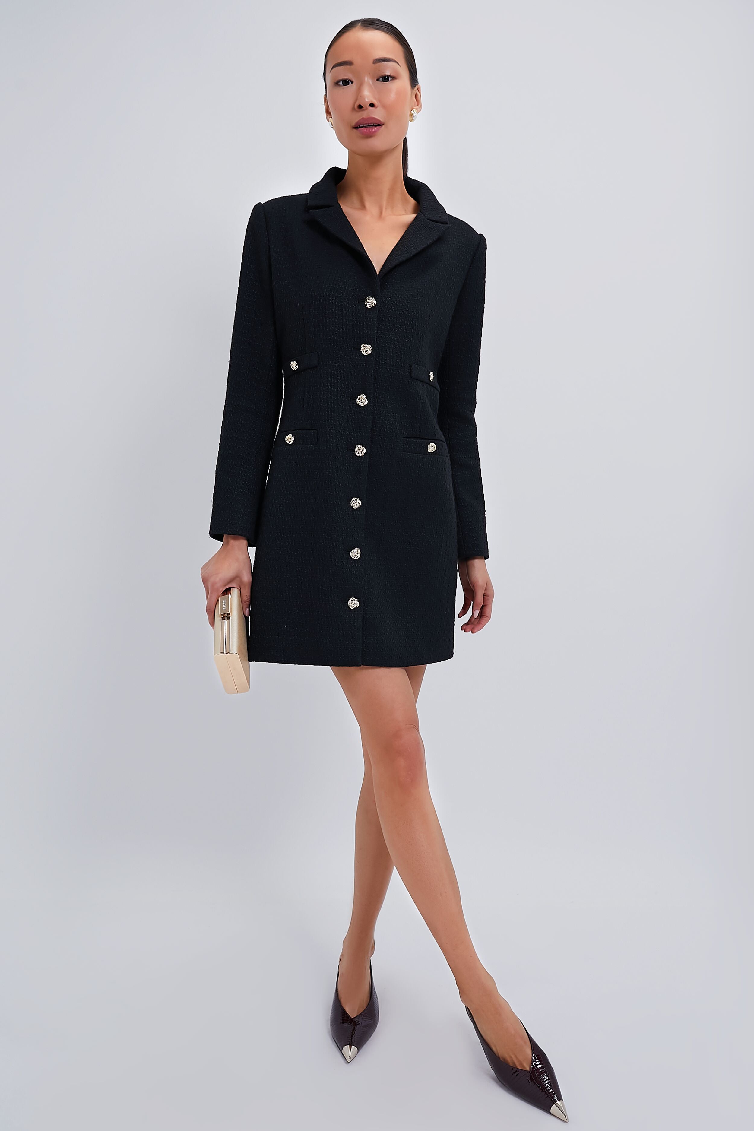 The Nina Heels are crafted from a luxe croc-embossed leather in a high-shine finish. This feminine pair features a sharp pointed toe accented with a gold metal cap. thin slingback straps. and a setback heel for a touch of height. Pair with wide leg trousers or a chic LBD and let these shine!