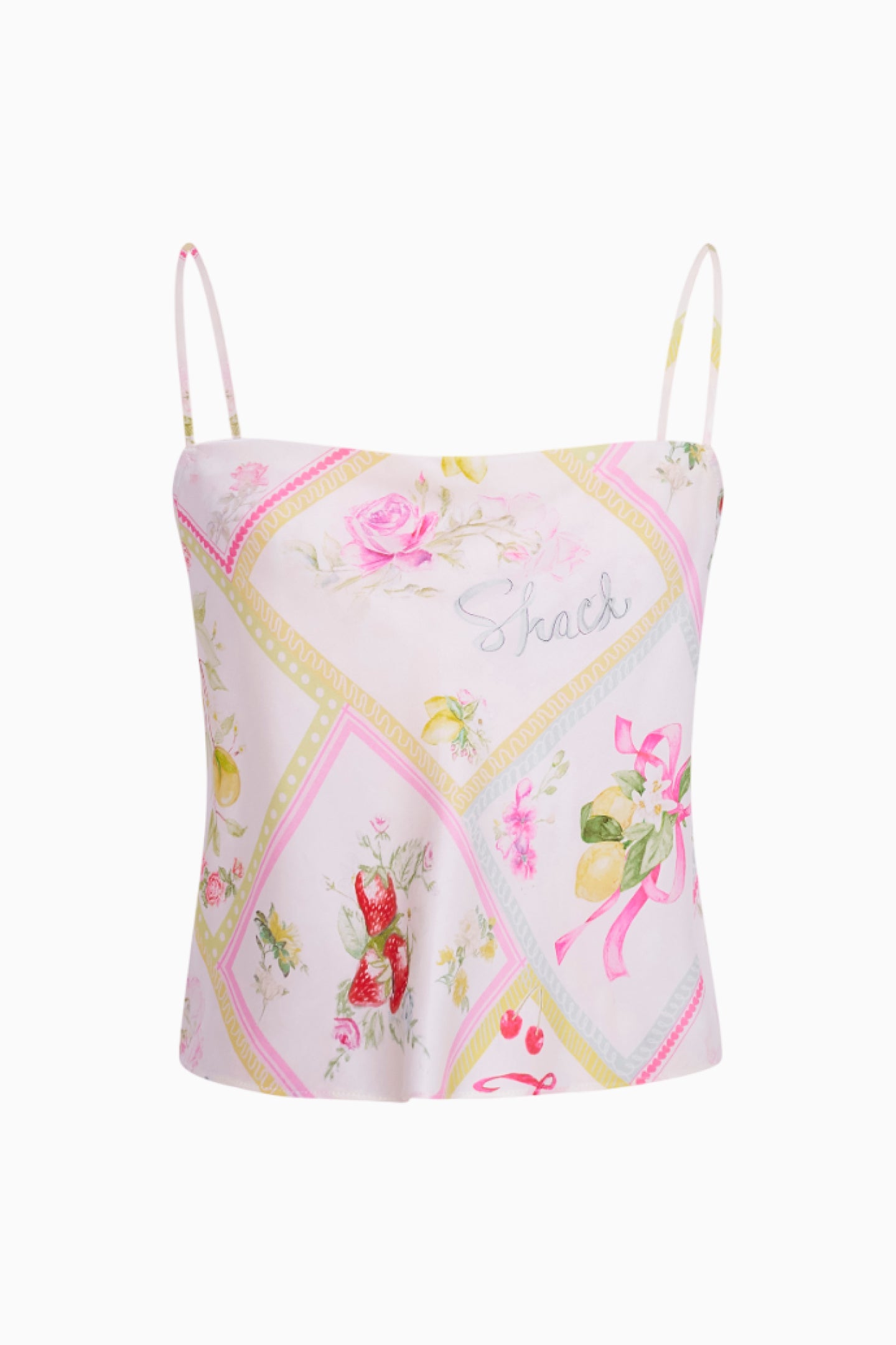 Feeling chic in the Cabi Top. Arriving in a silk blend charmeuse fabric. this pretty top features a beautiful hand-painted print of cherries. lemons. and florals amongst diagonal strips. inspired by postcards from Italy. The bias cut cami top is flirty and feminine with thin spaghetti straps and a flattering silhouette.
