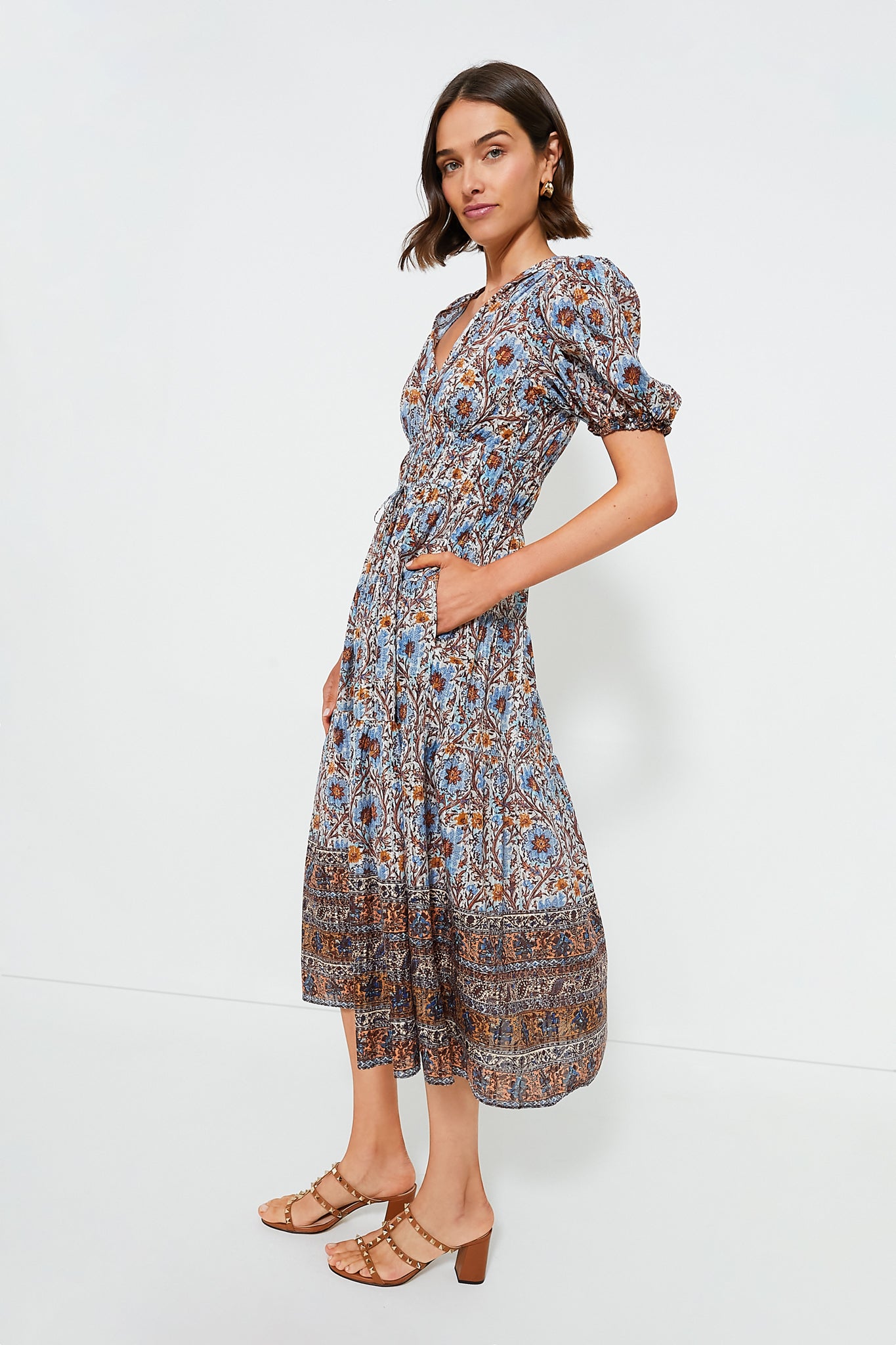 Feminine and elegant. the Caspia Ilana Dress is the perfect day-to-night style. Crafted from a lightweight shadow stripe with intricate. yet delicately hued florals that reflect the natural dyes from a vintage Persian botanical print. this midi features v-neck. puff sleeves. double drawstring ties at the waist. and has convenient side pockets. Finished with a tiered skirt. pair with ballet flats. espadrilles. or heels- this versatile beauty can go with anything and everything.