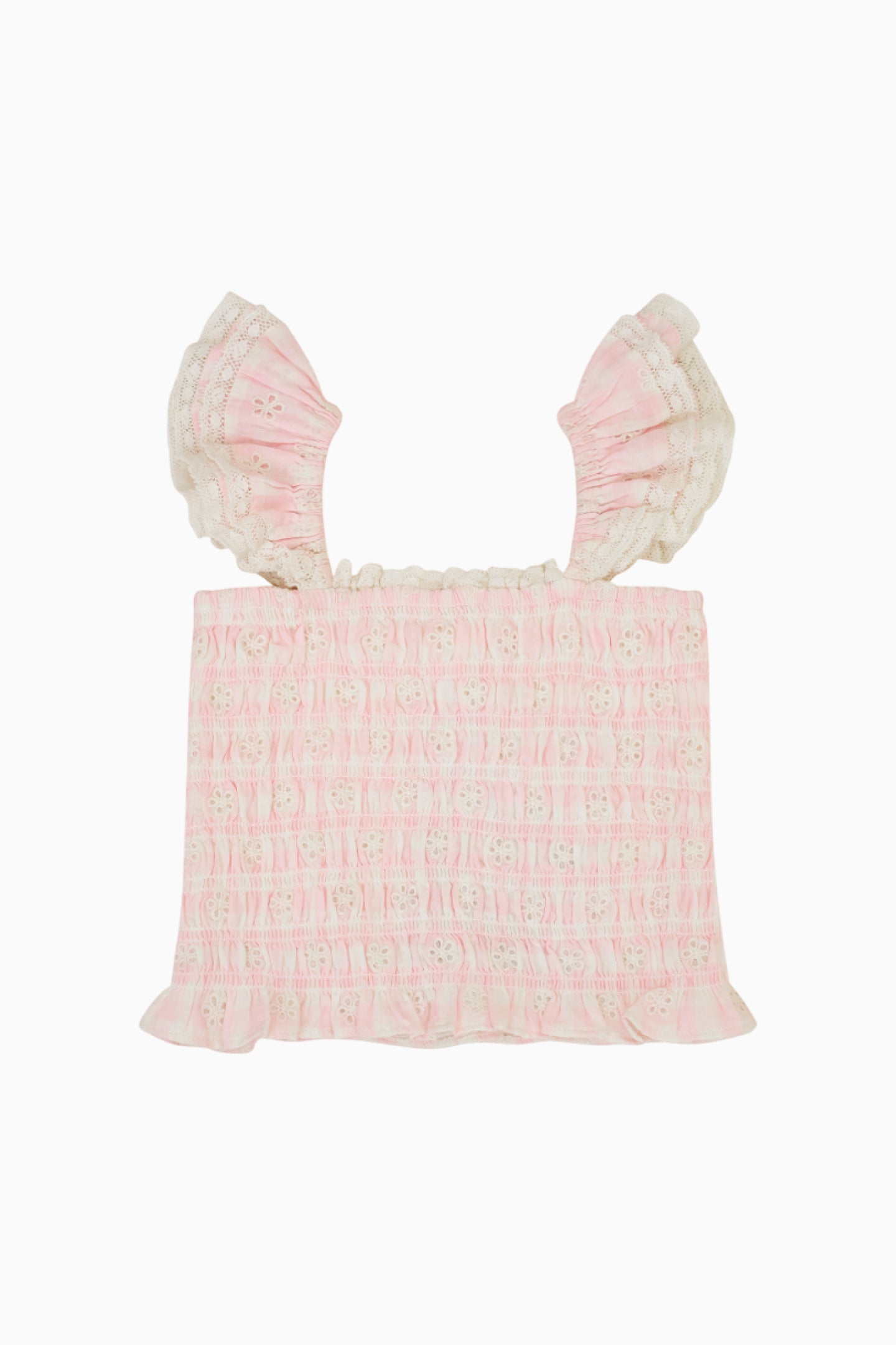 Forever sweet in the Caspia Top. Our little loves stun in this easy. warm weather top featuring tiny flutter sleeves with a ruffle. smocking all over. and a dainty ruffle peplum hem.