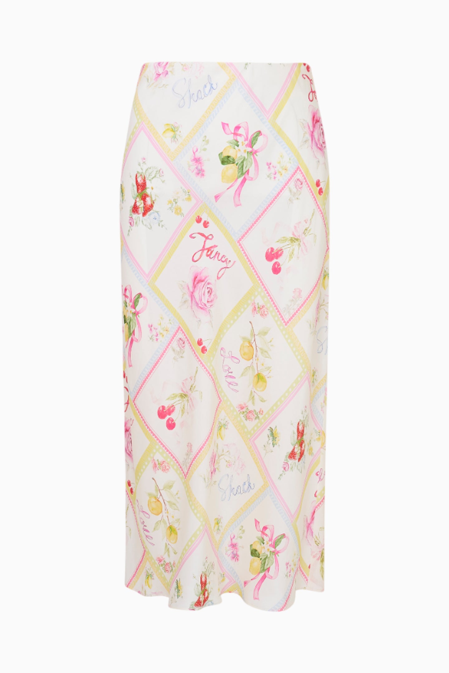 Everyone's favorite Castle Skirt returns for the season in a drapey. silk blend charmeuse fabric featuring a beautiful hand-painted print of cherries. lemons. and florals amongst diagonal strips. inspired by postcards from Italy. This Go Chicly essential is a bias-cut maxi skirt with a pencil slip shape. offering a flattering silhouette. The skirt features a lightly elasticated waist. ensuring a comfortable and slinky feel while still providing ease of wear. Effortless to pull on. the Castle Skirt combines comfort with style. At the sweep. the edge is finished with a beautiful fringe with a frayed edge. creating a unique and eye-catching detail. Pair with the Cabi Top for a full set.